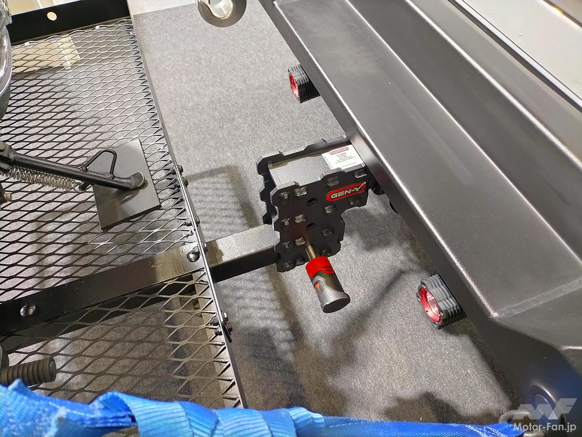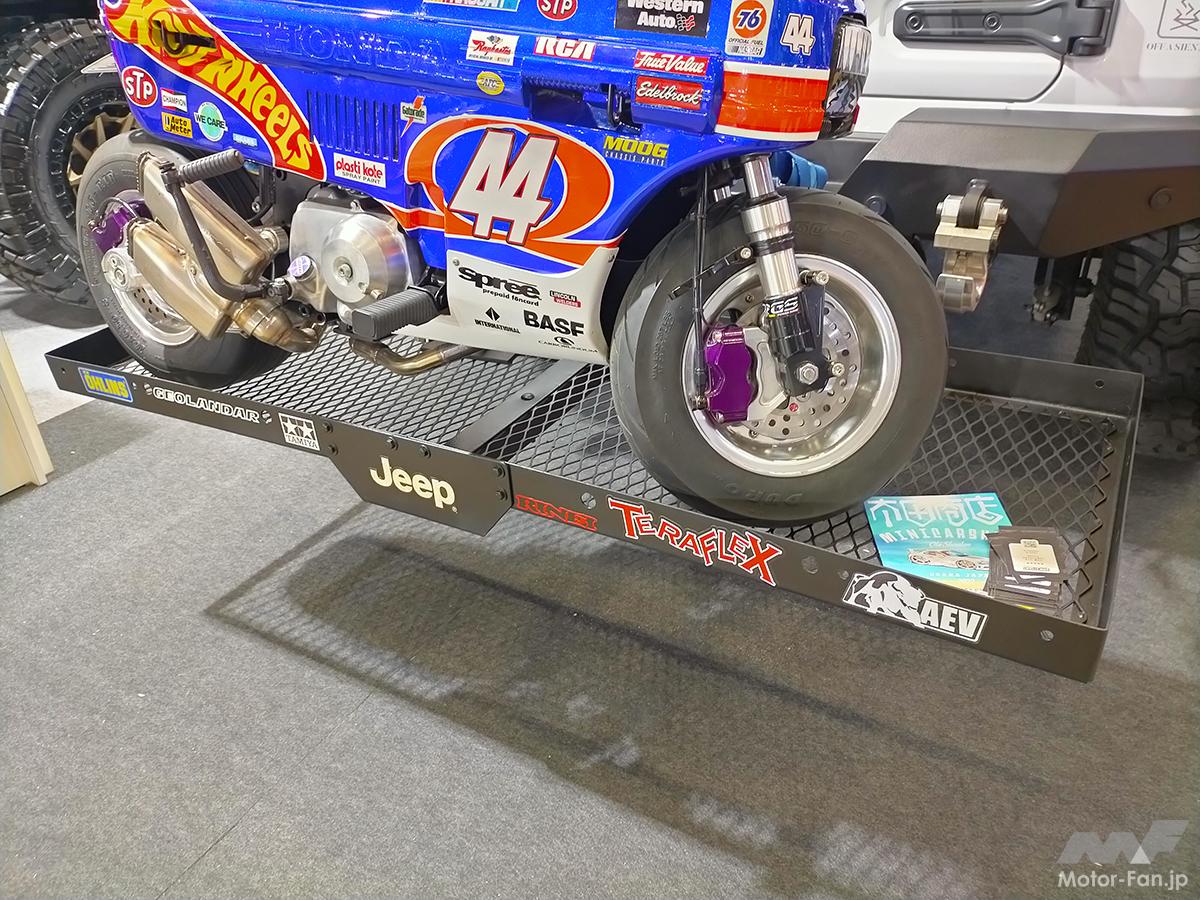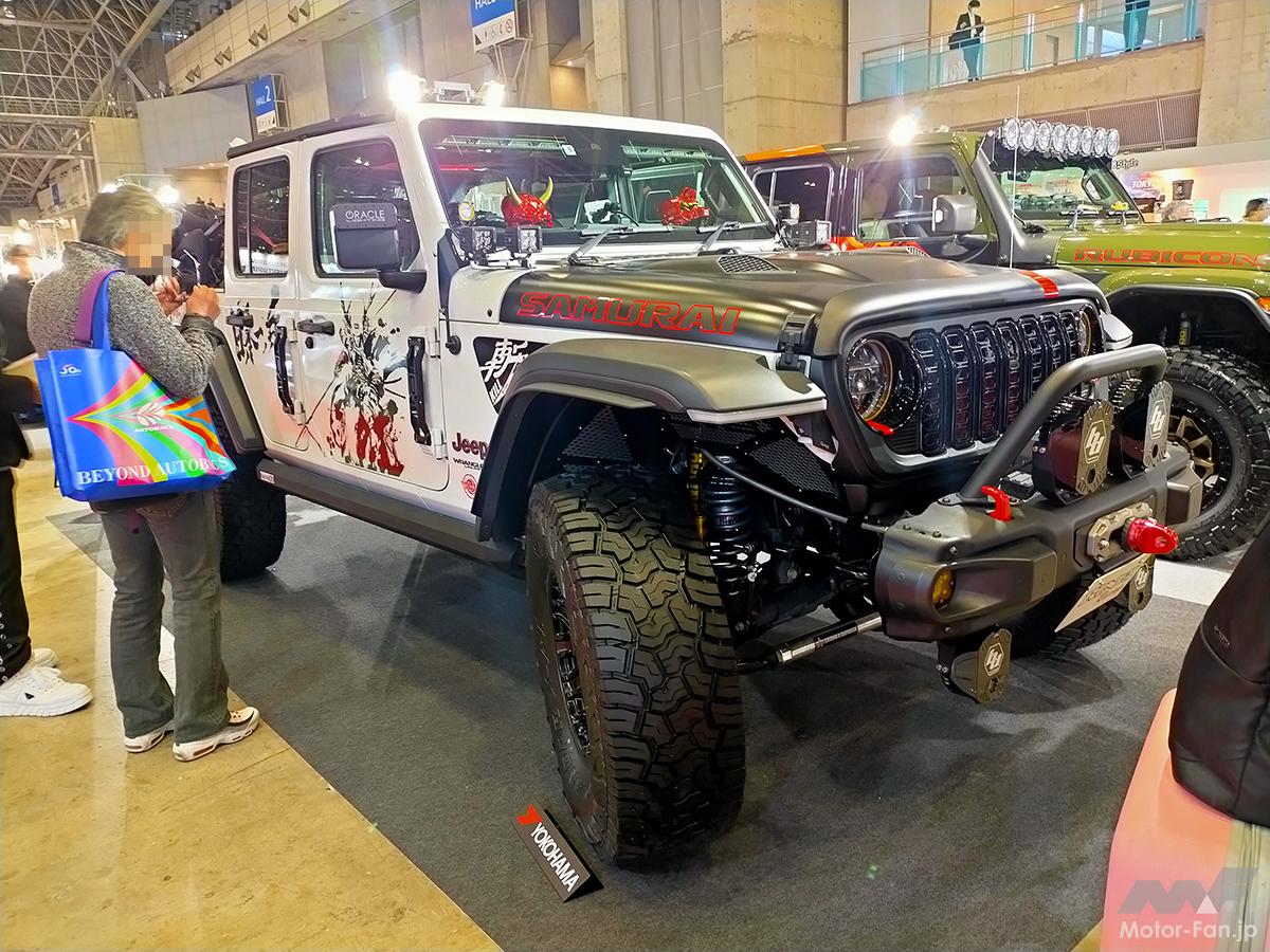 老舗の4駆専門店「RINEI」ブースに展示された写真のジープ・ラングラーは、カスタムショップ「OFFSIENNE(オフジェンヌ)」が製作した『SAMURAI WRANGLER(サムライ・ラングラー)』。後部には大型キャリアを装着し、カブエンジンを搭載したモトコンポ改を積載されている。