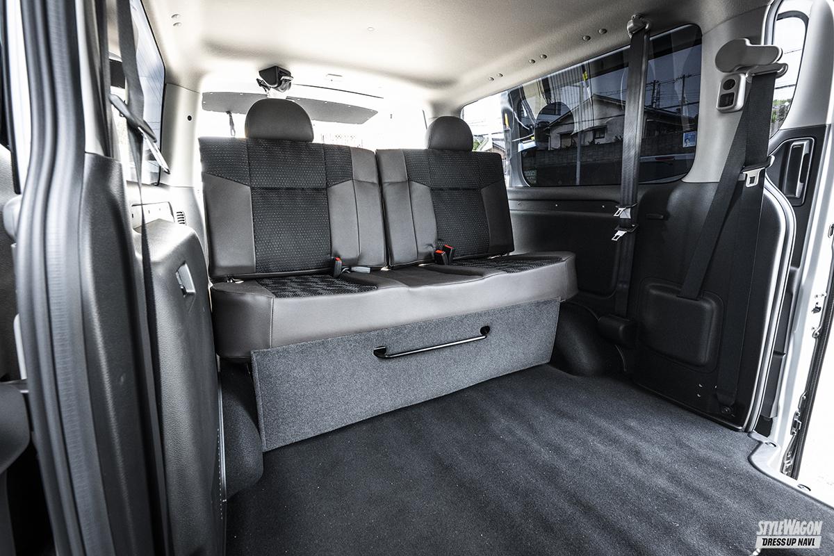 2列目は純正シートのまま、3列目シートを加えて8人乗りの乗用ワゴン化するコンプリートプラン。8人乗りにともない、当然シートベルトも増設。オプションで2列目シートをスライドレール化するなど、使い勝手の向上も可能だ。
