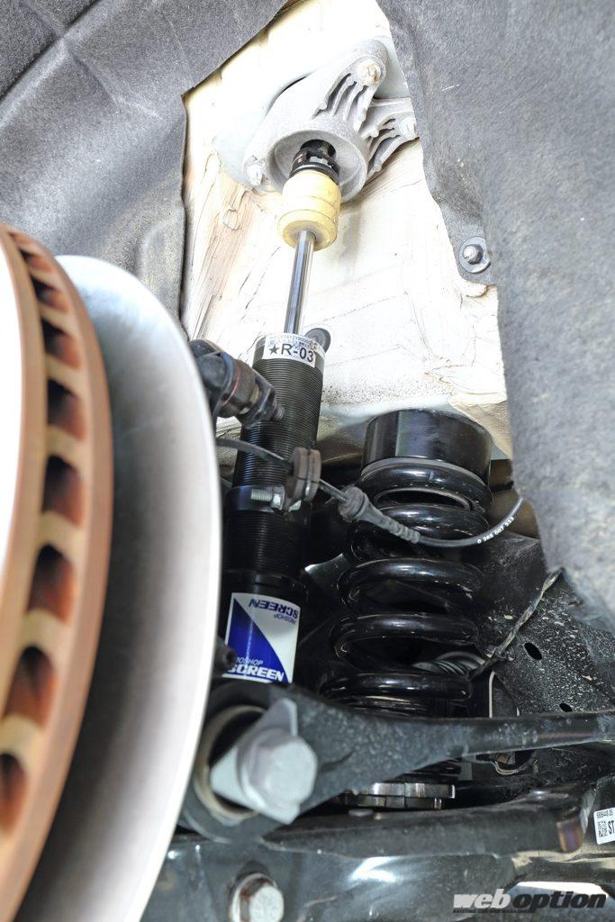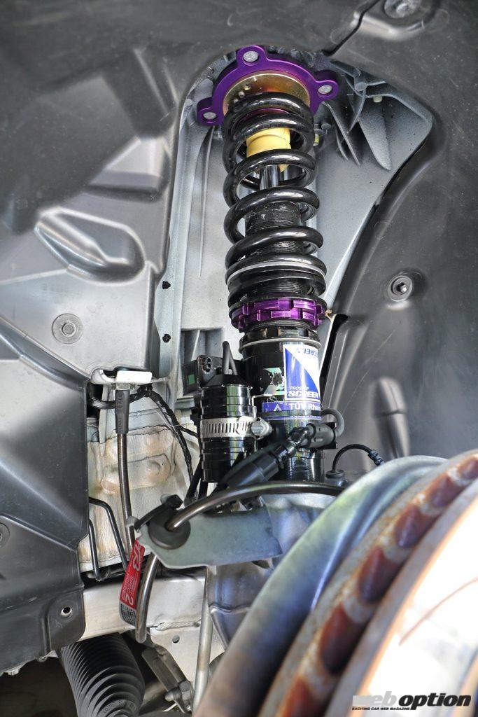 また、ロールが大きいと対角線上のタイヤが浮き上がってきてしまうため、これを抑える方向でセッティング。サーキットでのテストを重ねた結果、バネレートはフロント14kg/mm、リヤ20kg/mmを採用している。サーキット対応スペックとはいえ、少し硬過ぎるのではないかと勘ぐりたくもなるが、路面への追従性が高くストリートでも快適に走れるという。