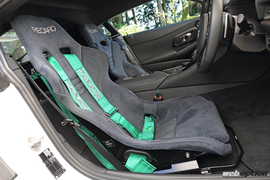 レカロシートの販売にも力が入るスクリーン。GRスープラに相応しいモデルとして選んだのは、RS-Gアルカンターラ。レーシーながら高級感が溢れるインテリアを構築している。