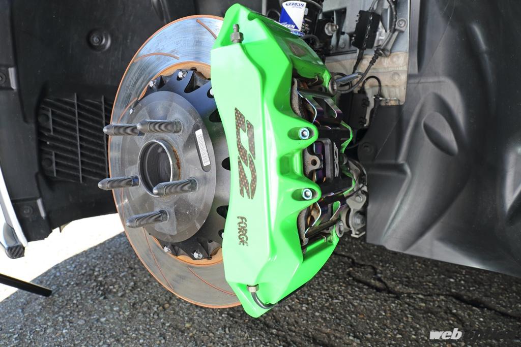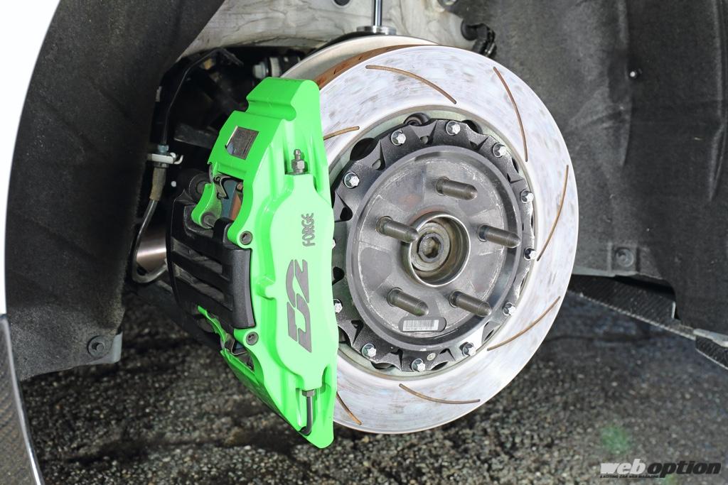 それだけに、サーキットで酷使するにはキャパシティ不足なのは否めない。そこで、このデモカーではD2のモノブロックキャリパーキットを投入。フロント8ポット+356mmローター、リヤ4ポット+356mmローターを組み合わせた。