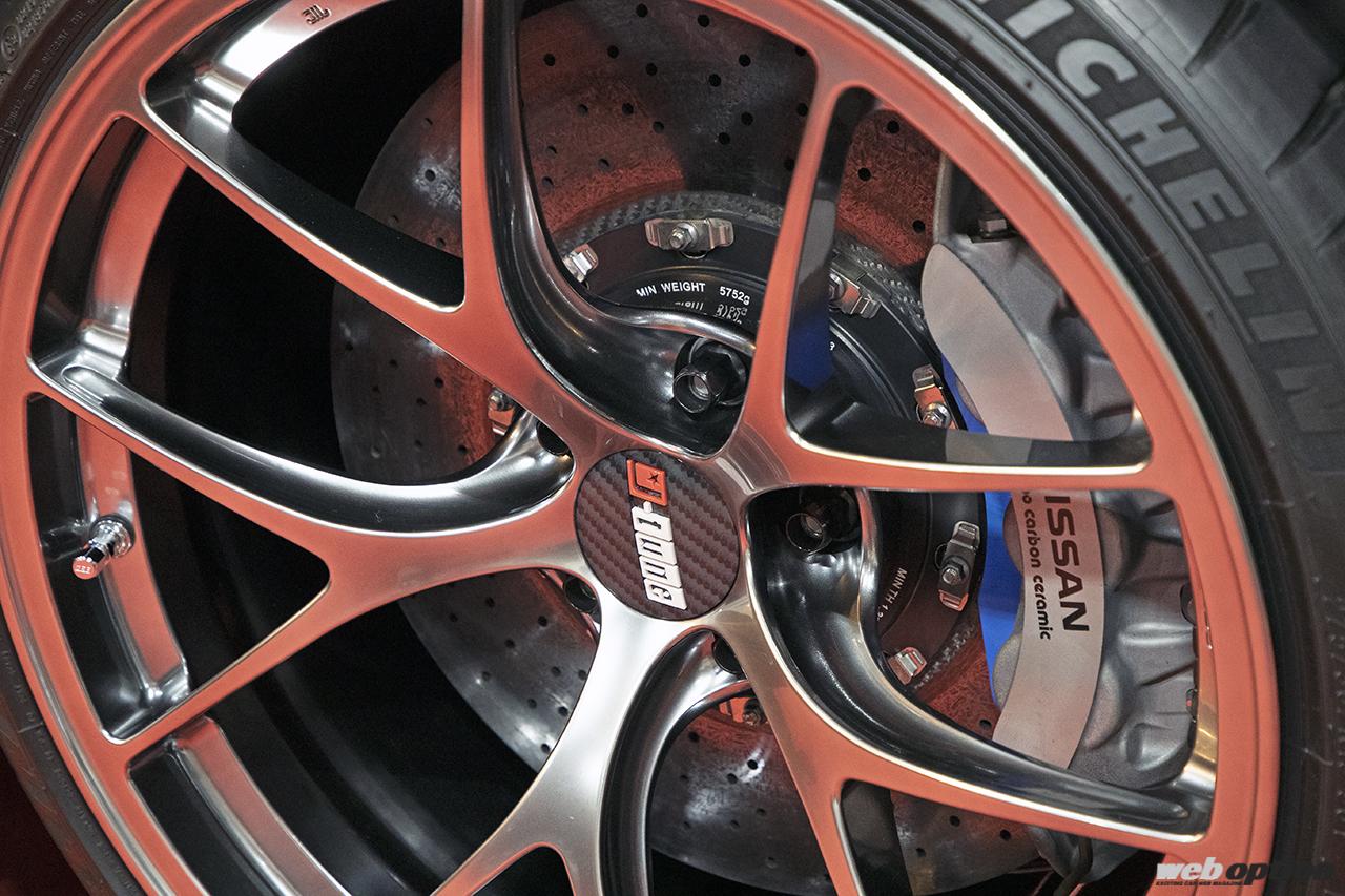足回りはZチューンに限りなく近い仕様で設計。ホイールはBBSのRI-D(10.5J×19+15)の特注カラー仕様で、繊細なスポークの隙間から覗くブレーキシステムは、R35GT-RスペックVの鍛造アルミキャリパー+カーボンセラミックローター(F390mm R380mm)だ。