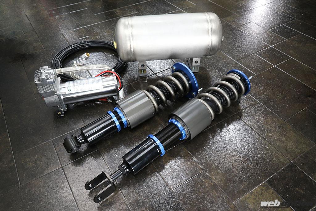 これは、従来のアクティブオリジナル車高調(F10kg/mm R8kg/mm)に、リフトアップ用エアシリンダー(前後)をドッキングした逸品。段差越えなどのタイミングで活躍するだけでなく、全開のスポーツ走行にも対応する懐の深さを持った、まさに“いいとこ取り”のシステムなのだ。