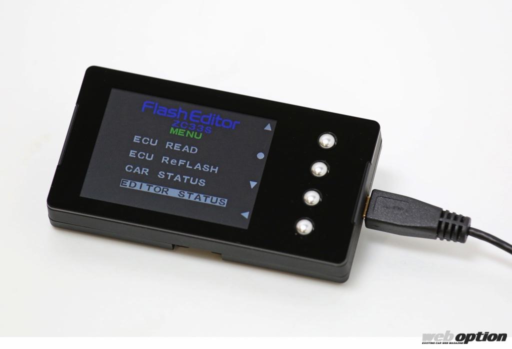 ご存知の通り、ZC33S用のチューニングECUは多くのメーカー&ショップからリリースされている。HKSも例外ではなく早い段階からマスタリーECUを発売していた。しかし、それらは全て純正ECUを取り外してデータを書き換える必要があった。つまり、プロショップや販売店に車両を持ち込む、もしくは純正ECUを郵送するといった煩わしい作業が伴っていた。