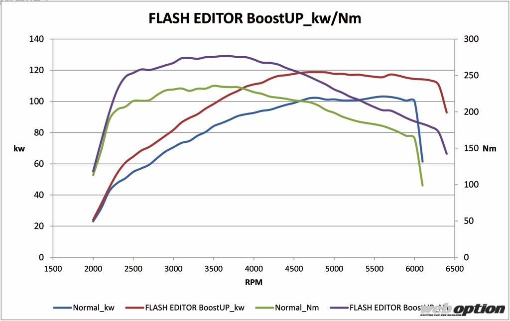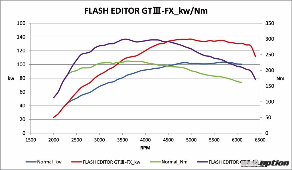 フラッシュエディターによりブースト圧はノーマルの1.05キロから1.3〜1.35キロまで引き上げられ、最高出力159.1ps、最大トルク28.1kgmを達成(ノーマルは最高出力140.8ps、最大トルク24キロ)。約20psのエクストラパワーを手に入れつつ、2000rpm〜6000rpmという常用〜高回転域の出力特性を改善させることで、数値以上にパンチ溢れる走りを生み出してくれる。