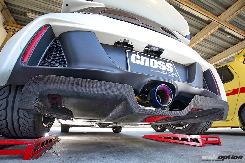 チューニングも自由自在になりつつあるが、大阪の“テイクオフ”はそうした現状を見据え、兵庫の“パワーハウスDTM”と共同で本格的な下面の空力パーツ開発に着手。そこで誕生したのが、リヤアンダーディフューザーだ。