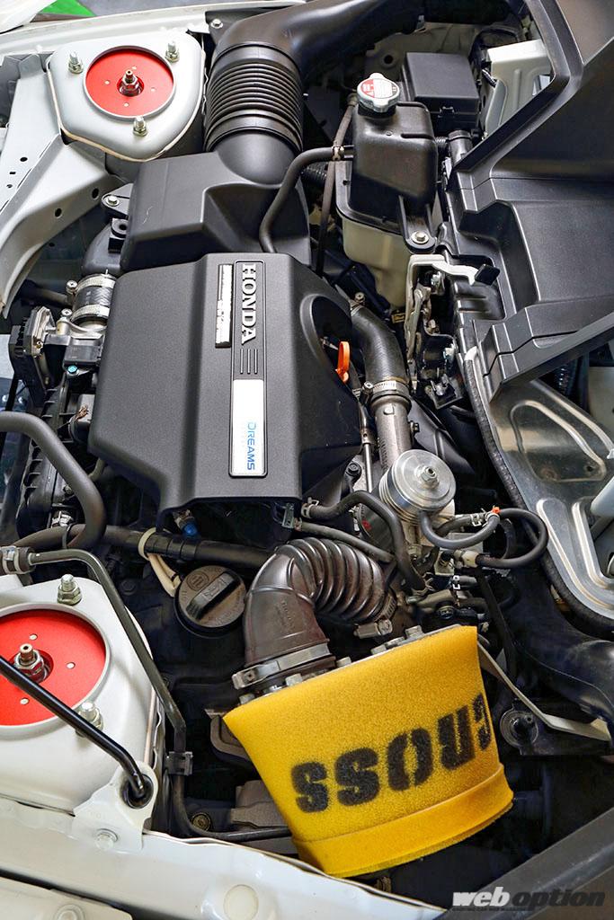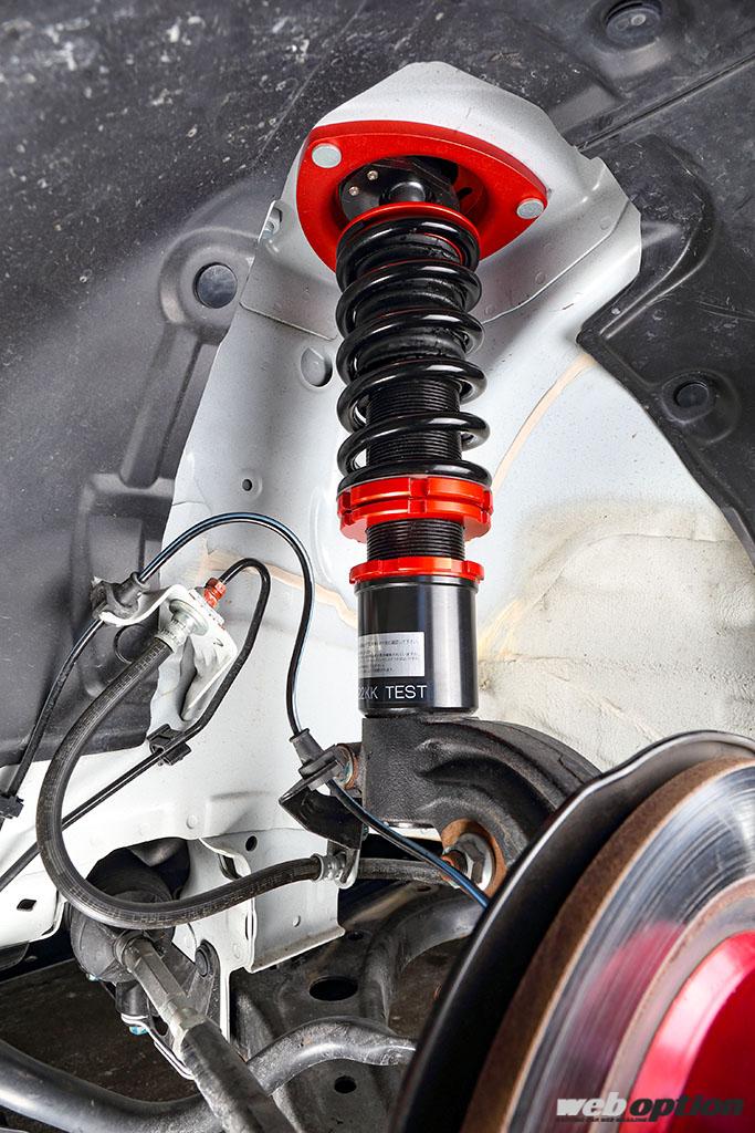 足回りは、オリジナルのC.R.Fアジャスタブルダンパーでセットアップ。これはフルタップ式の車高調(前後減衰力15段調整)で、スプリングレートはF4kg/mm、R6kg/mmが基準値だ。ストリート用として開発された逸品だが、サーキット走行にも十分対応できるスペックを持つ。