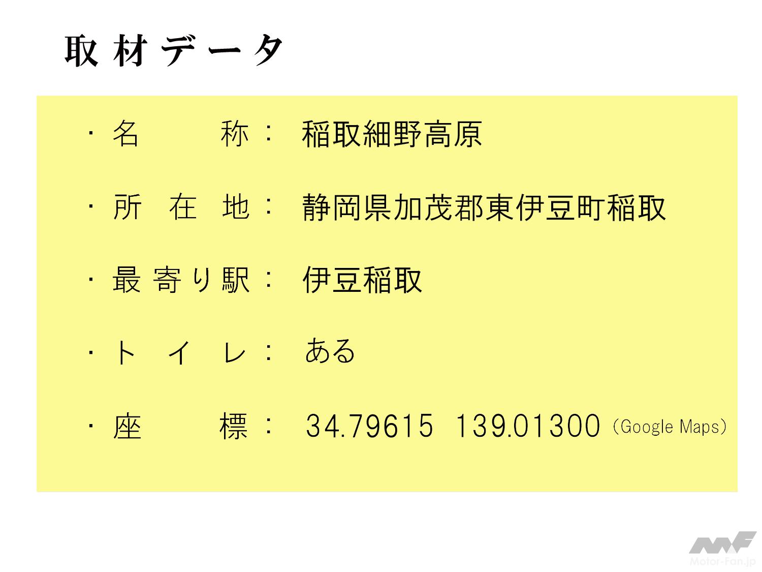 今回の座標ポイントは細野高原ブランコがある緑豊かで壮大な高原として知られる「稲取細野高原」です。その面積は約125ヘクタール(東京ドーム26個分)だそう。春は新緑のワラビなど山菜が豊富。秋はススキの群生が美しい。ブランコの直ぐ脇に縦長の第一駐車場があり、トイレもある。