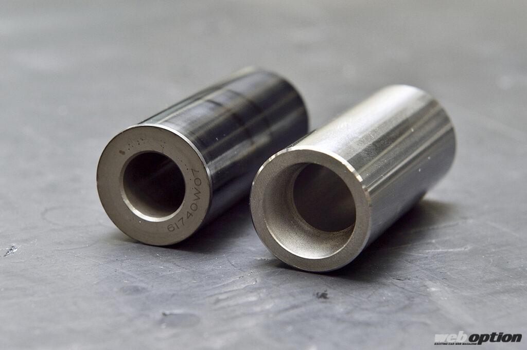そこでHKSが用意したのが、強化ピストンとコンロッドのセットだ。ピストンはもちろん鍛造品の87.5φで、高温強度に優れるA2618材の採用で軽さと高剛性を両立させたブリッジ構造を実現。