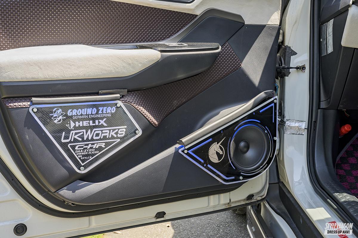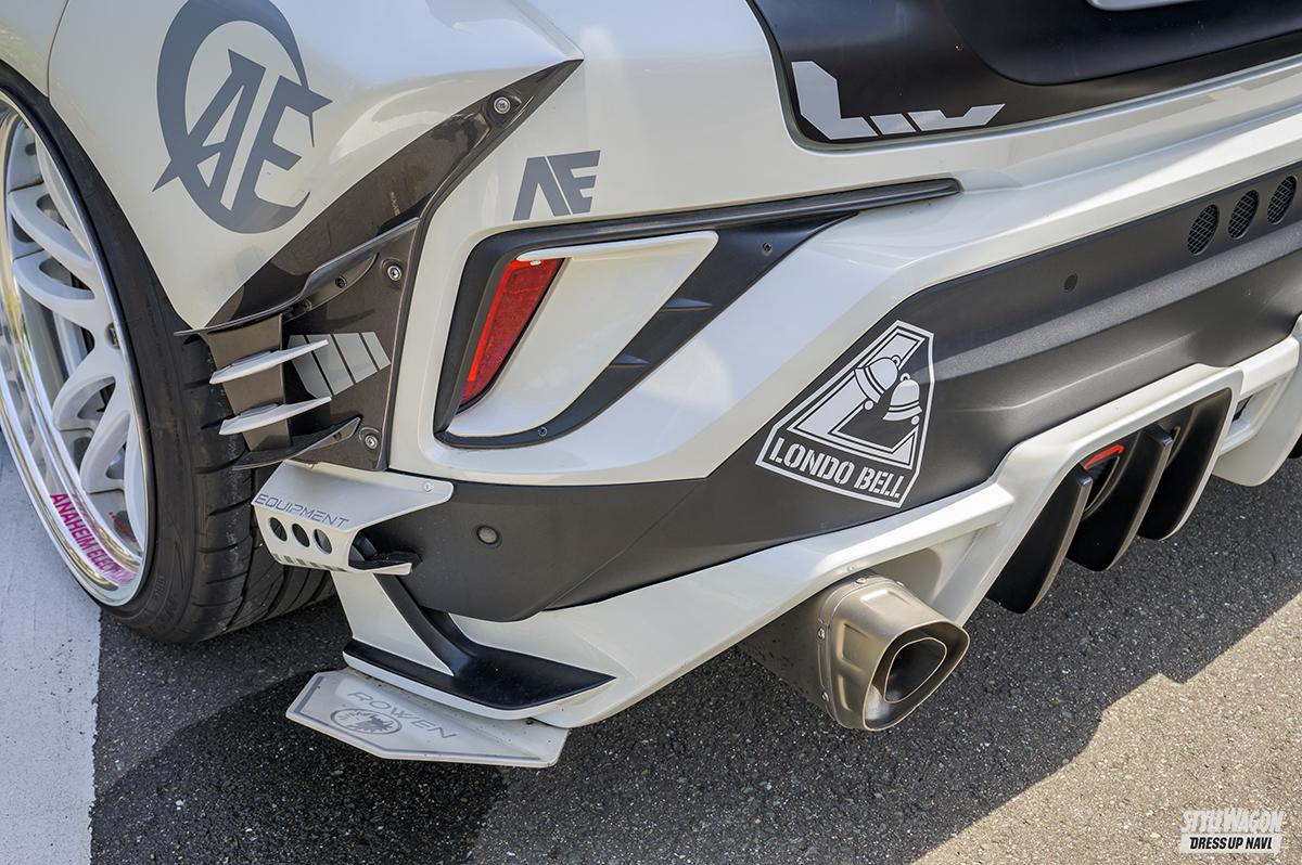 こちらは全国でも有名なひろき@兄さんの、ガンダムモチーフのC-HR。ワイドフェンダーはビヨンド、フロント、リアエアロはロェン、さらにノブレッセのリアウイングとワイドなGTウイングを組み合わせるなど、まさにモビルスーツばりの攻撃的なルックスに仕立てられている。その他、マフラーカッターやフロントドア下のダクト風カバーといった、バイク用パーツをアレンジするなど、カスタムエキスパートとしてのスキルが存分に発揮されている。