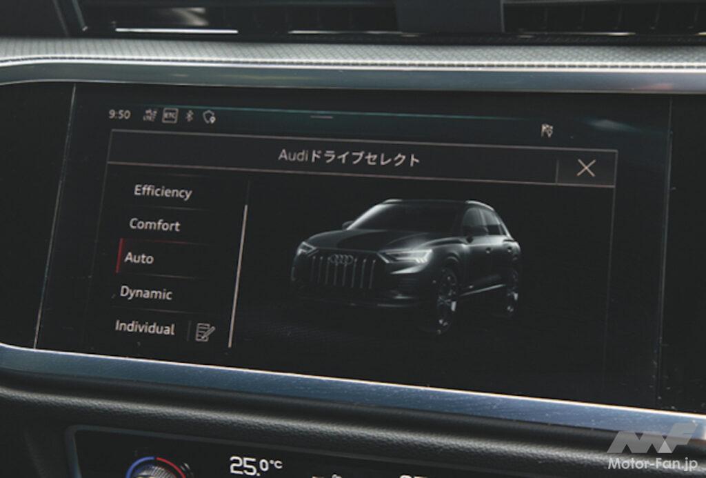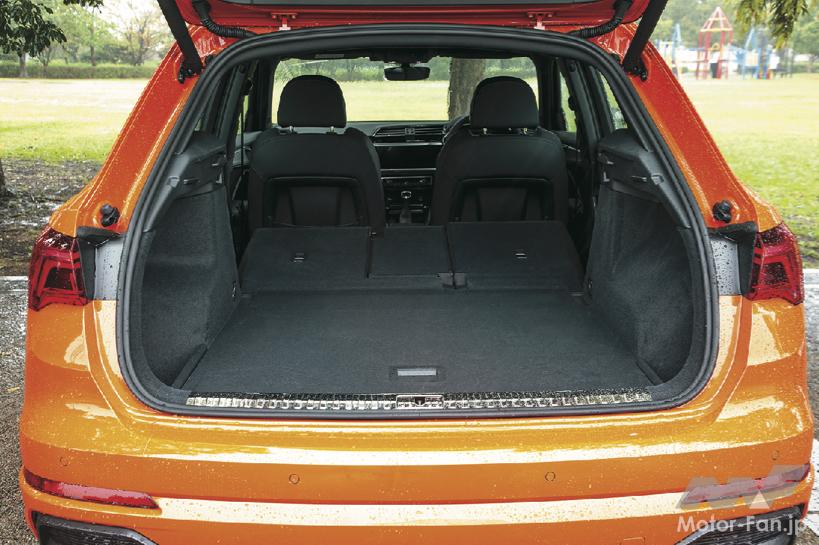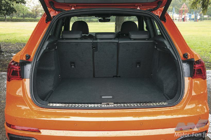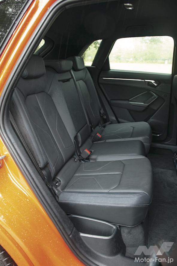 先代(初代)Q3は、全長が4400mm以下に収まって比較的コンパクトだった。それが二代目の現行型は、Q2が加わった影響もあり、4500mm前後のミドルサイズに拡大された。後席も広く、身長170cmの大人4名が乗車して、後席に座る乗員の膝先空間は握りコブシふたつ分だ。CX-5と同等だから、4名で乗車して長距離を快適に移動できる。
