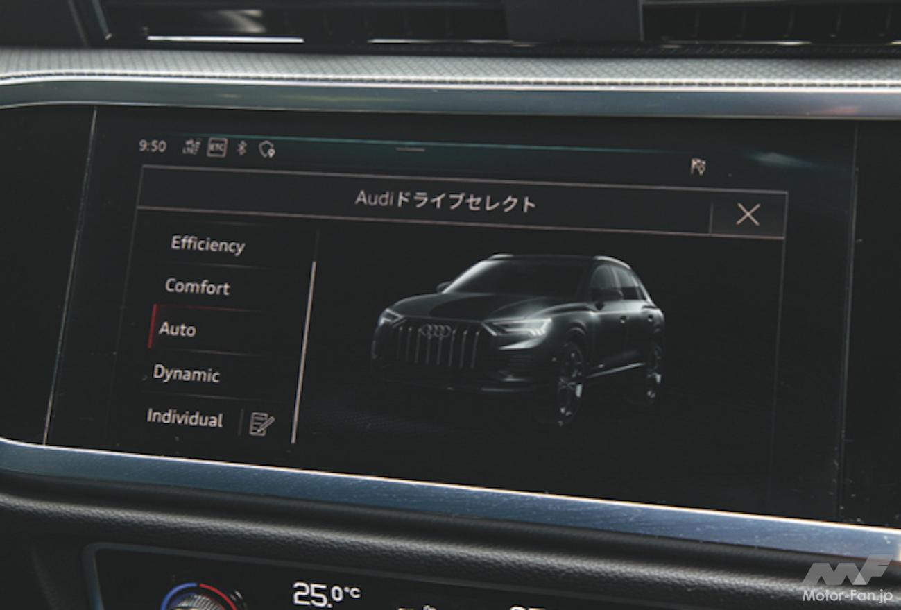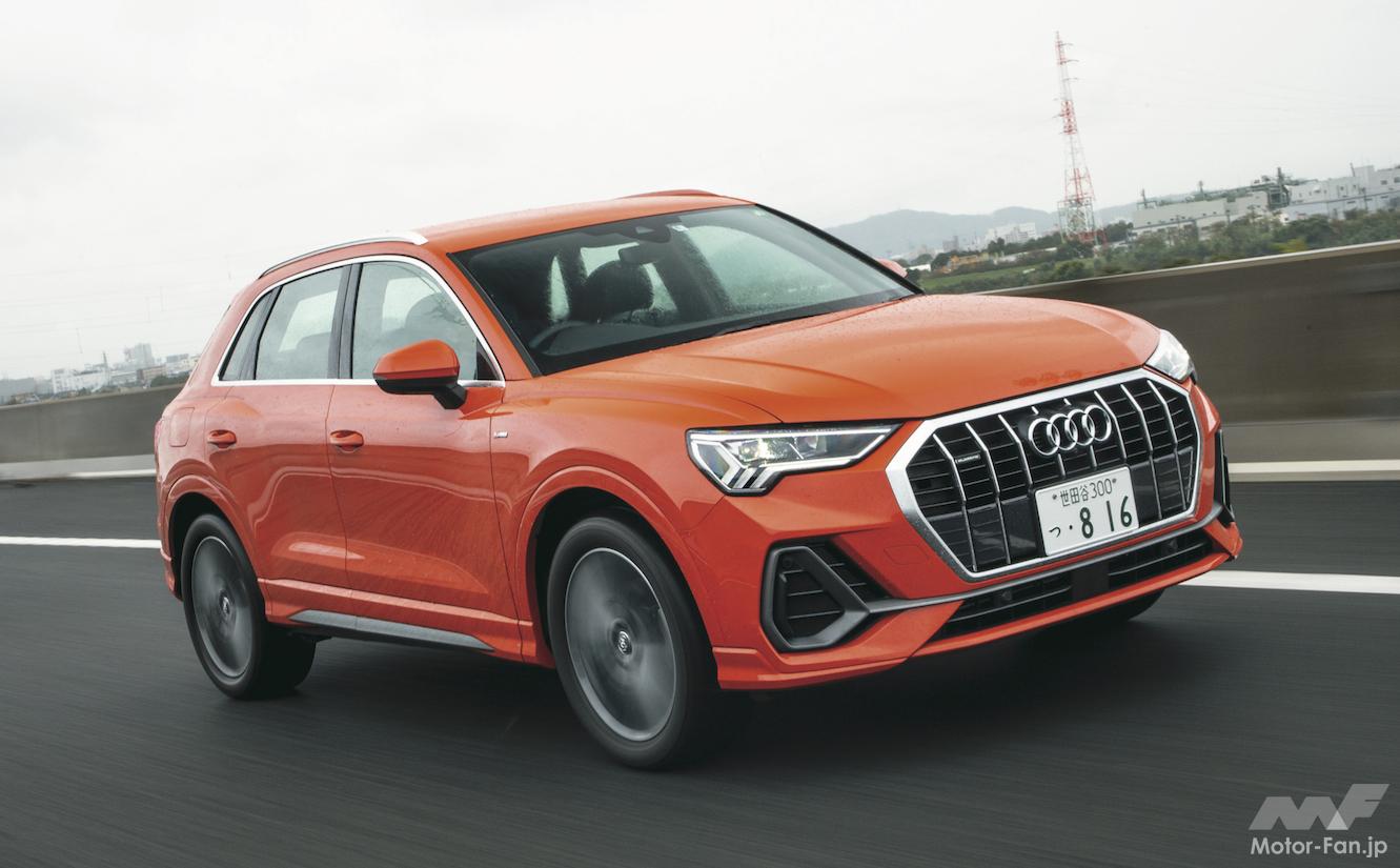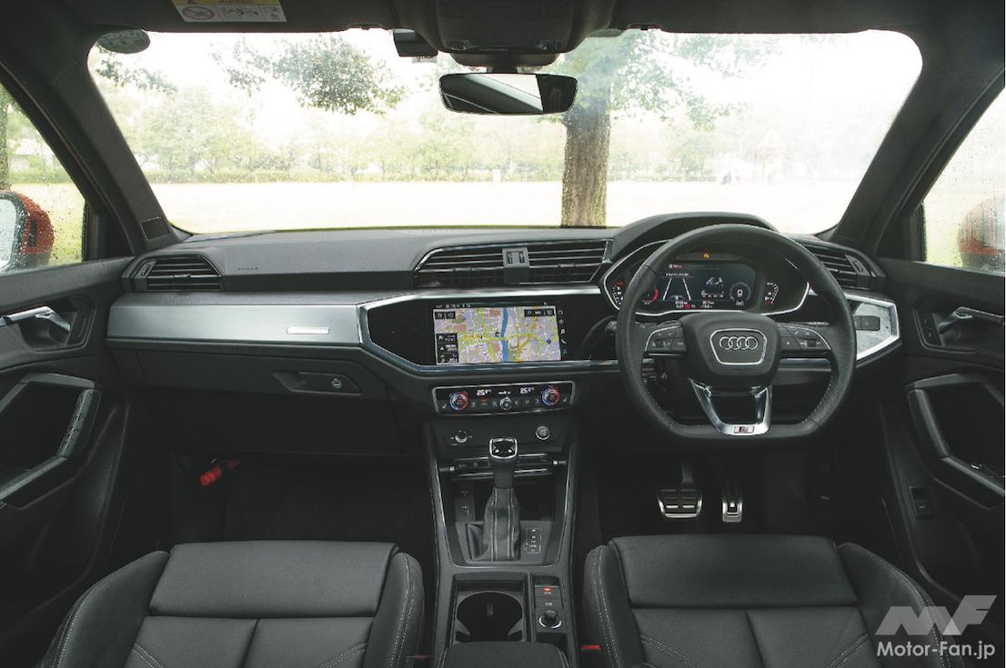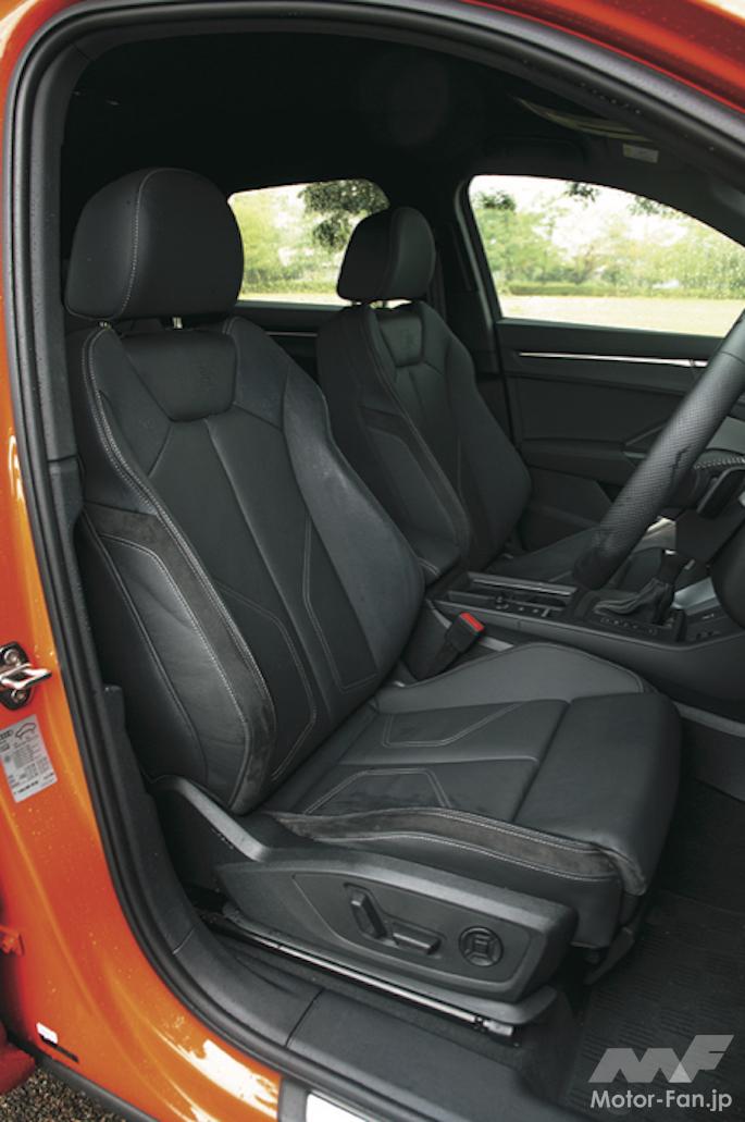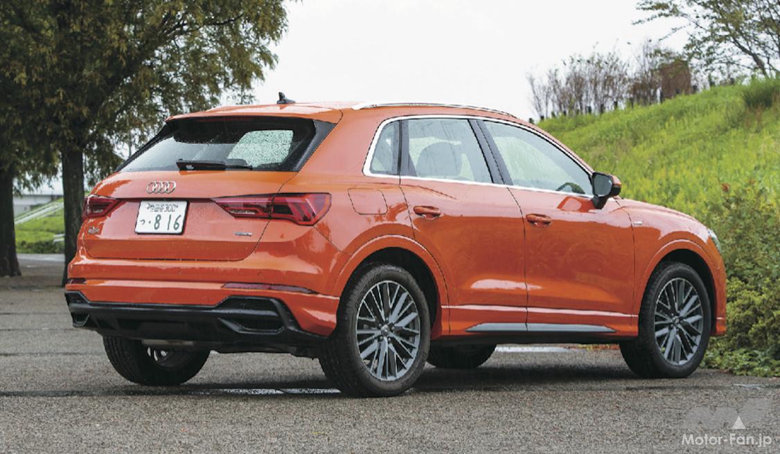 先代(初代)Q3は、全長が4400mm以下に収まって比較的コンパクトだった。それが二代目の現行型は、Q2が加わった影響もあり、4500mm前後のミドルサイズに拡大された。後席も広く、身長170cmの大人4名が乗車して、後席に座る乗員の膝先空間は握りコブシふたつ分だ。CX-5と同等だから、4名で乗車して長距離を快適に移動できる。