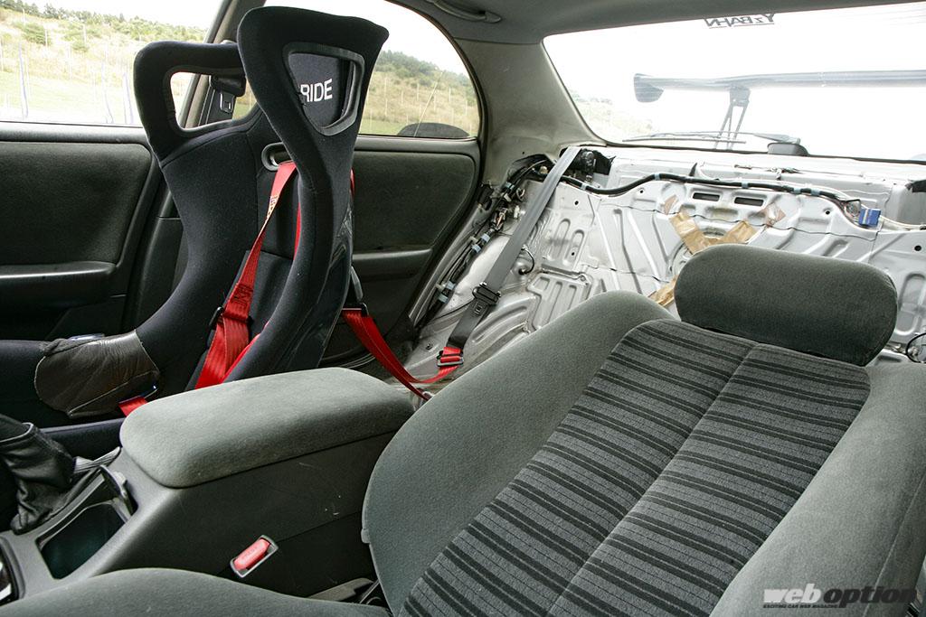 サーキット走行時以外は、リヤシートも装着しているという室内。フルバケが装備されているくらいで、ロールケージも無いシンプルな仕上がりだが、純正メーター位置にはデフィのDSSCがさり気なく導入されている。