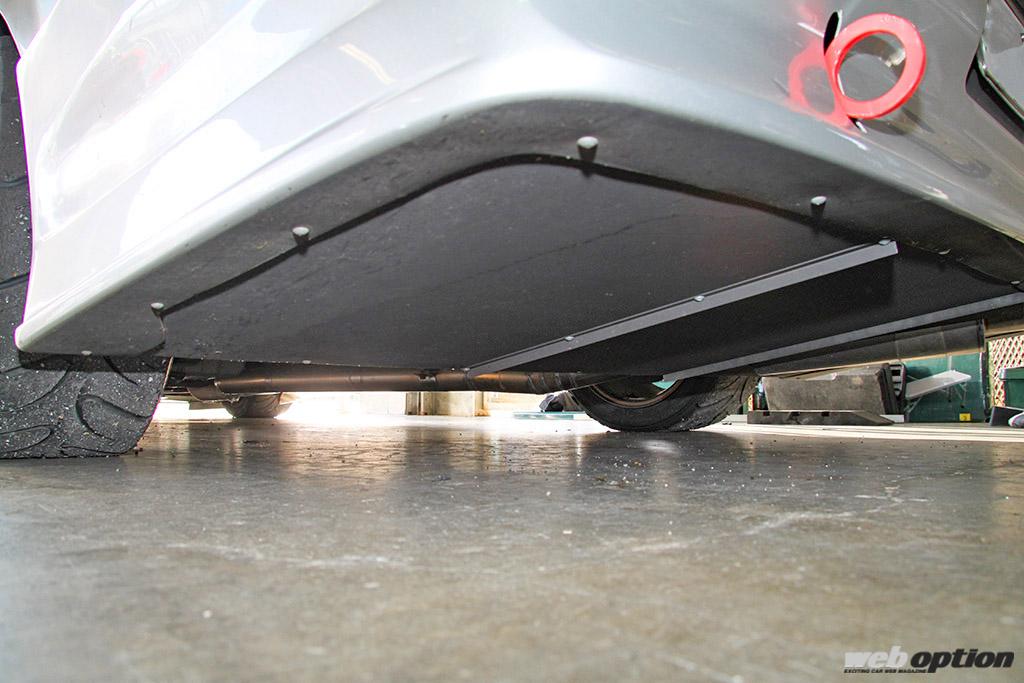 ワンオフで製作してもらったという前後のアンダーパネルは、装着前に比べてトップスピードが5km/h以上落ちるほどの効果を発揮。高速コーナーでは強烈なダウンフォースを体感できるという。