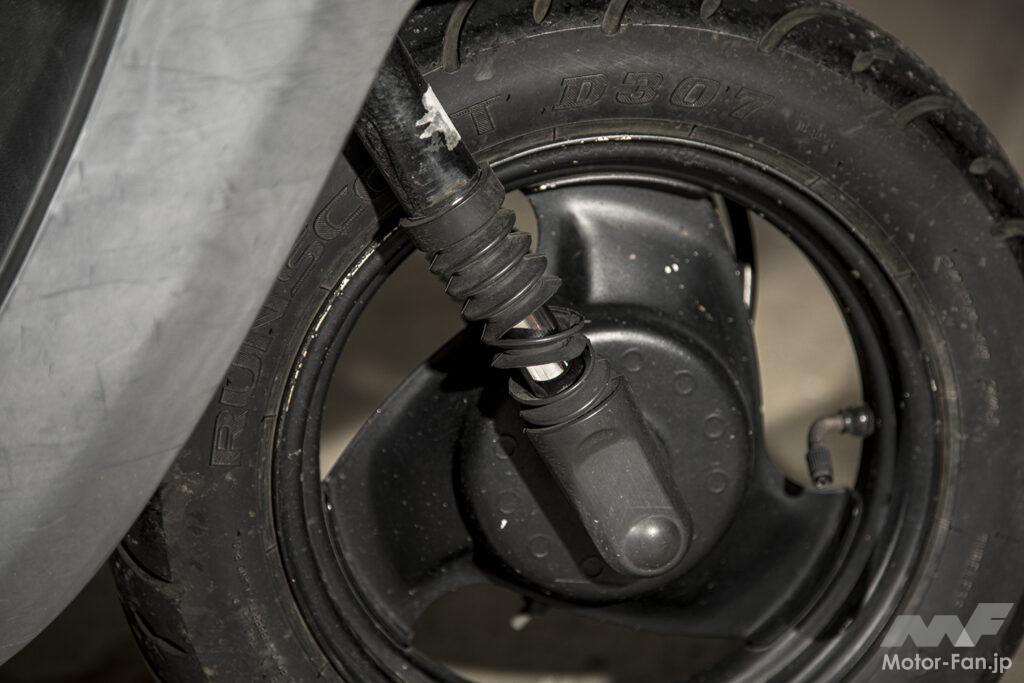このJOGアプリオのフロントフォークは一般的なオイルでダンパー制御するタイプとは異なり、バネとグリスで構成されるシンプルな構造。フォークオイル交換のように定期的に分解整備を必要とする前提ではなく、メンテナンスフリー構造なので、分解するのは大変です。