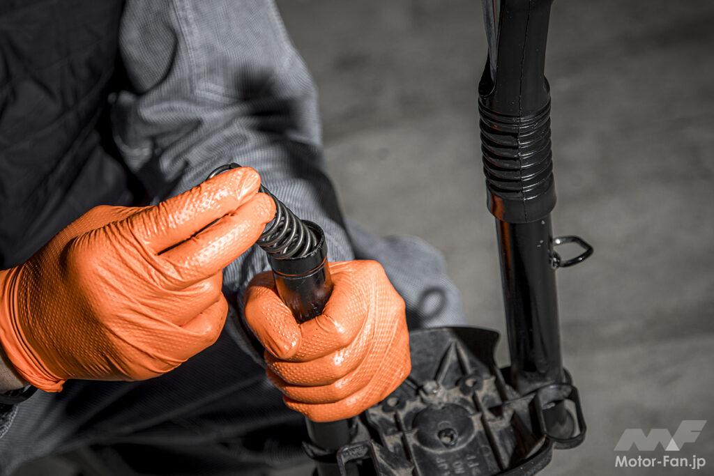 この機会にフロントフォーク内部はパーツクリーナーで洗浄し、新品のシャシーグリスを塗布。逆の手順で組み付けていきます。