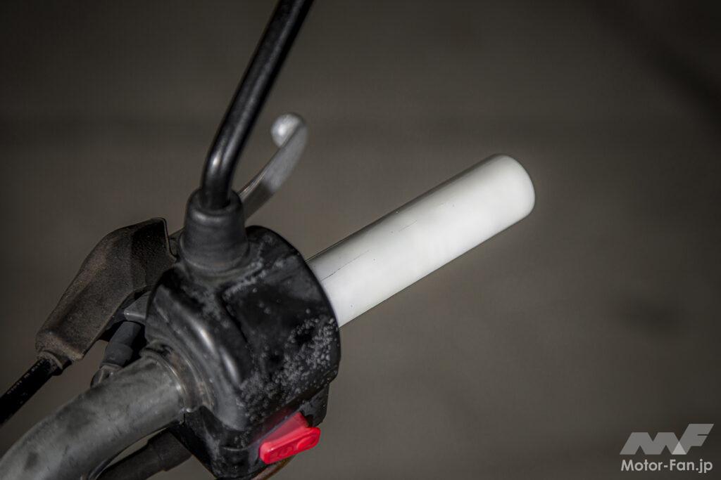 おそらく20年以上も使い続けてきたであろうこのハンドルグリップは、表面のゴムの粒が完全に摩耗してツルツル状態。滑りやすいので、普段から強く握りしめてスロットルを操作していた。正直、ちょっと疲れる仕様だったです。