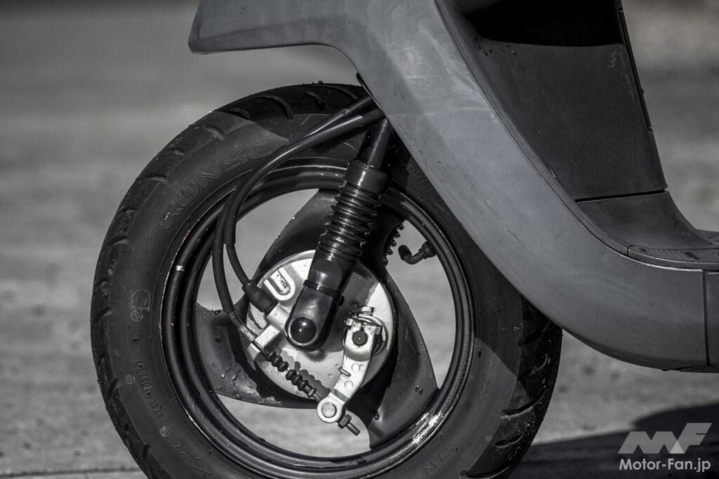 ホイールを外して下からスポッと抜くだけ……と思いきや、ドラムブレーキ側のフォークの突起が引っかかり抜けず。三又ごと外したほうが手っ取り早いようです。