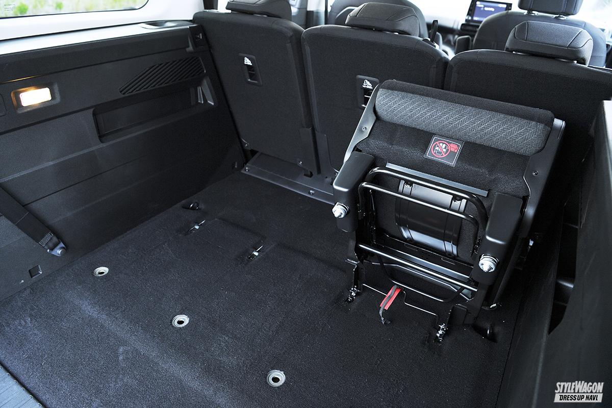 mm。幅は約1200mm、高さは約1120mmだ。3列目シートの背もたれを倒した場合、2列目シートまでの奥行きは約1300mm。さらに2列目シートも格納した場合の奥行きは約1860mmとなる。ちなみに助手席の背もたれを前倒しすることも可能。