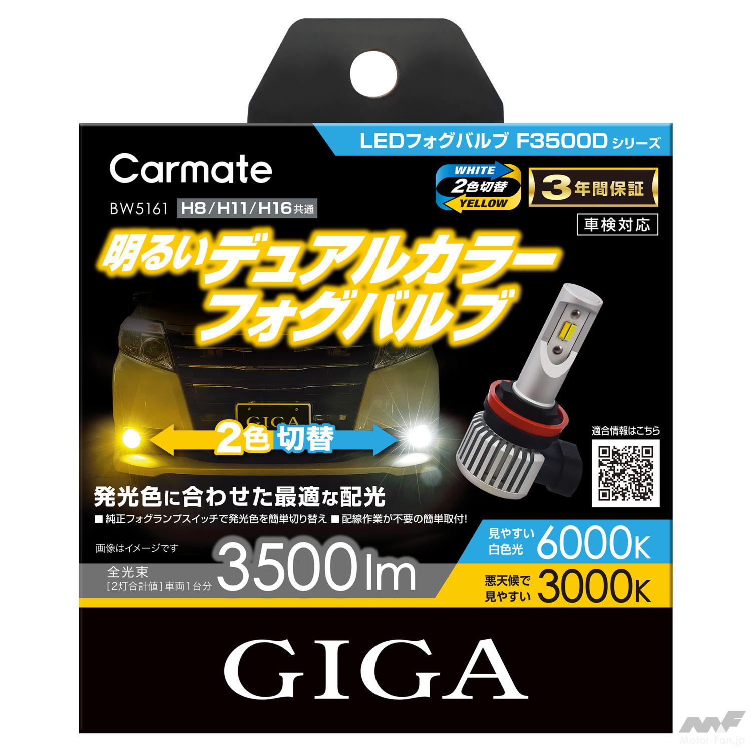 『BW5161 GIGA LEDフォグバルブ F3500D』は遠方を照らしてヘッドライトの明るさをサポートする色温度6000Kの白色光と、手前側をワイドに照らして悪天候時の見やすさを向上する色温度3000Kの黄色光を切り替えて使えるバイカラーモデル。発光色の切り替えは純正スイッチのON/OFF操作で行なえ、車両への加工作業は不要だ。