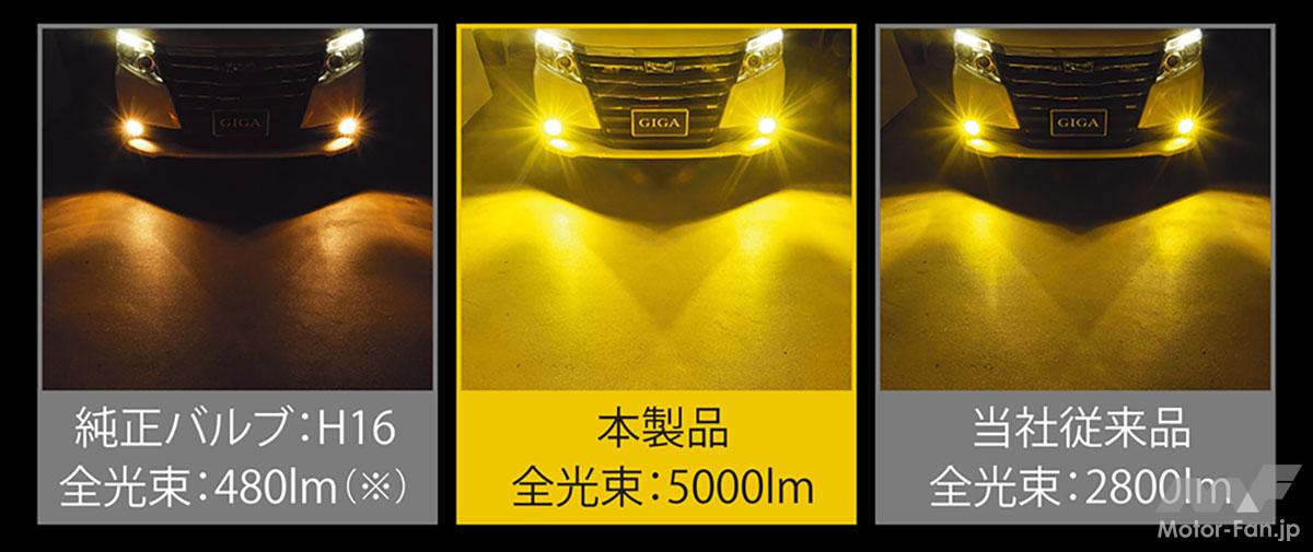 また、『BW5151 GIGA LEDフォグバルブ F5000S』はクラス最高レベルの明るさを達成した色温度3000Kの黄色光モデル。純正品の約10倍、従来品の約1.8倍という圧倒的な明るさは悪天候時の安全運転に貢献してくれる。