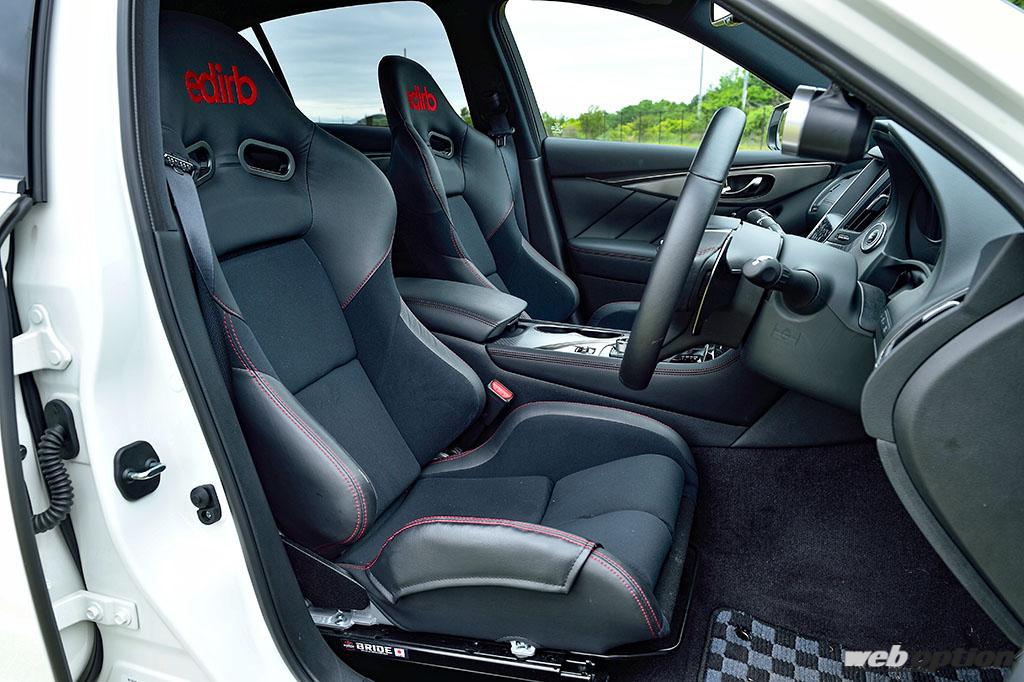 プレミアムスポーツセダンの400Rに合わせて、シートはブリッドのプレミアムモデルedirb033を装着。ダッシュボード周りでは、Aピラーに装着されたブーストメーター以外は至ってノーマル。快適なストリートクルーザーに仕立てられている。