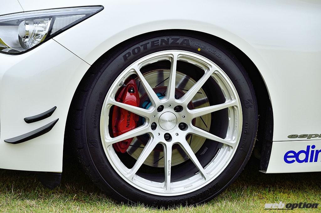プロドライブ0100ホイール(9.5J×19+40)に組み合わされるのは、ポテンザRE-12D(245/40R19)。なお、アライメント設定はタイヤの転がり抵抗低減を狙った最高速仕様とされている。