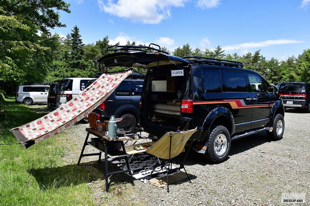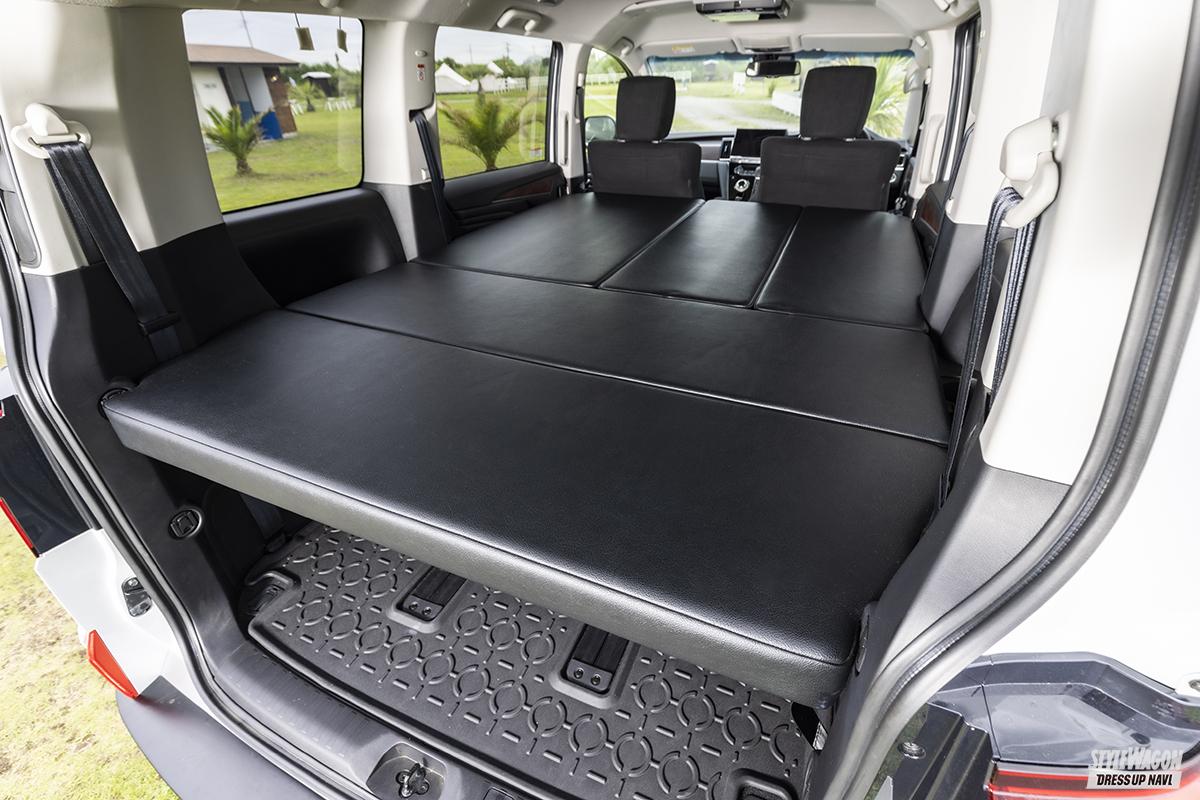 アルパインスタイルの車種専用マルチベッドキットをお借りして車中泊を実践。まず、固定用フレームは純正アシストグリップなどと共締めするなど加工の必要はなし。5枚のベッドをフレーム上に並べるだけでフラットなスペースが誕生した。さっそく横になってみると、完全フラットで心地良いのはもちろんだが、まず感じたのは安心感。ベッドの厚みは80ミリあり、支えるフレームも強固なので、傾いたり、変に沈み込むことなく大人でも落ち着いて横になれる。3列目シートを外さずにベッド化できるのがポイントだが、それ故ベッド上に座ってくつろぐには少々窮屈。とはいえ、2m近いフラットベッドは開放感抜群。朝まで腰も背中も痛くなることなく快適に寝られました! デリカ乗りはぜひチェック!
