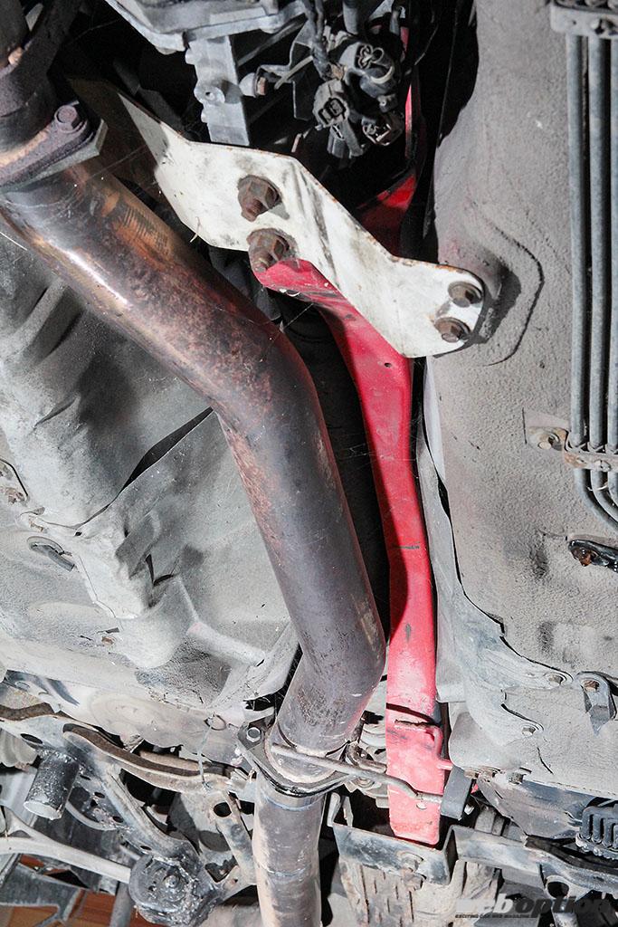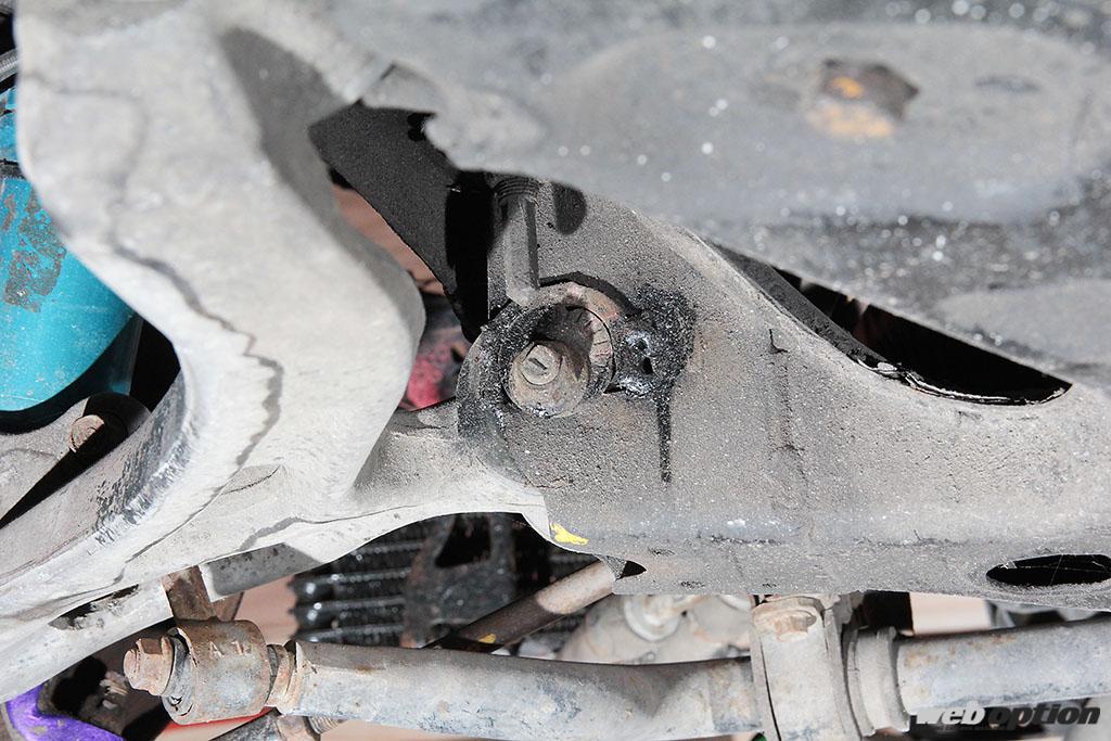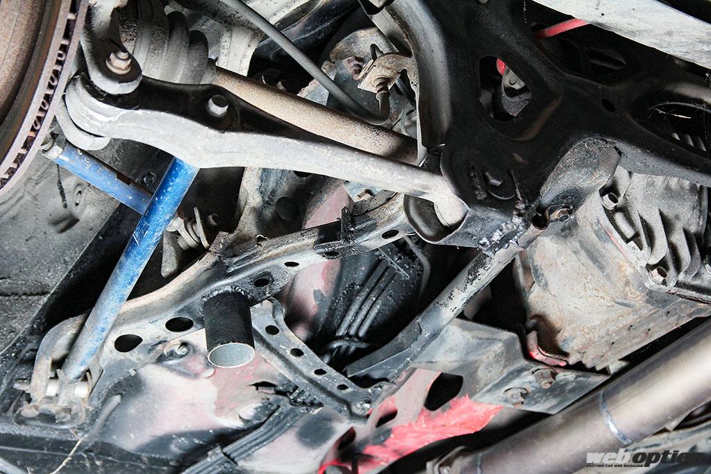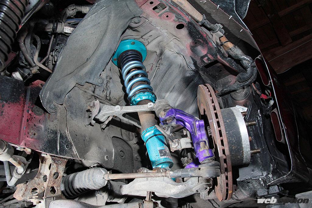 ケツ乗りのトラクションを稼ぐため、リヤが沈み込んだ時にキャンバー角がゼロになるようロアアームの取り付け部を内側に20mmオフセット。そこに溶接された鉄パイプは、PPF補強プレートに繋がっている。溶接された単管はジャッキアップポイントだ。