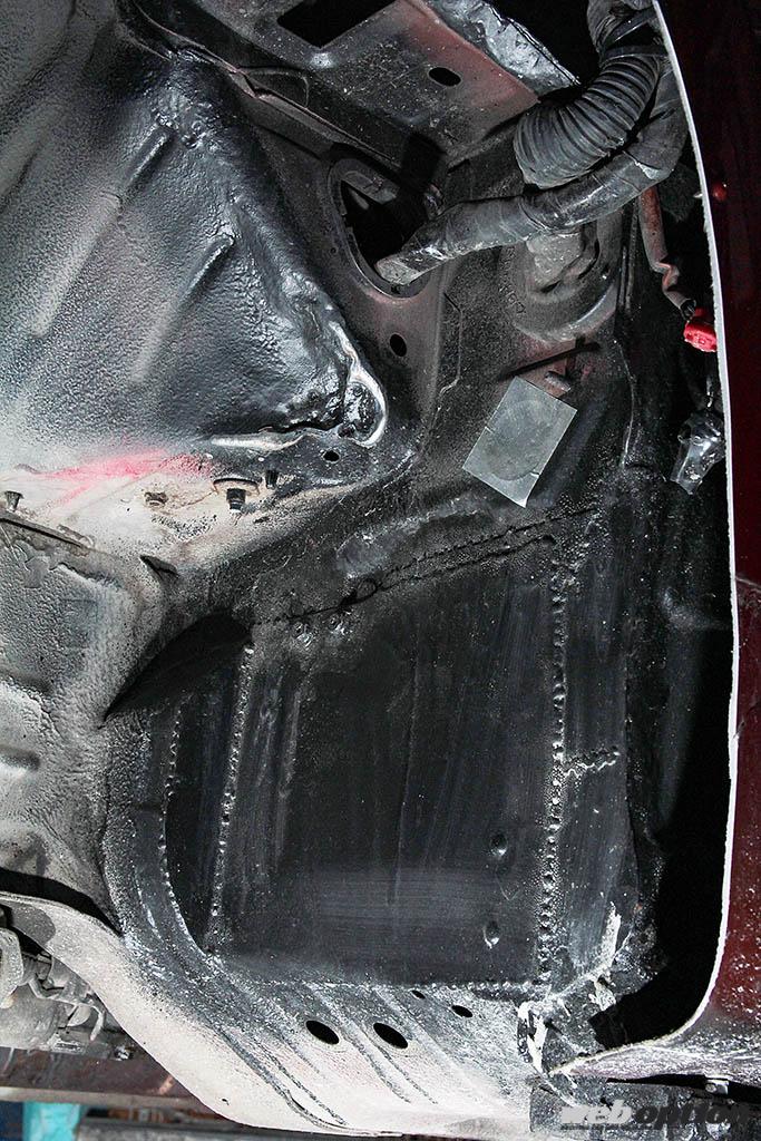 切れ角アップに伴う干渉対策も万全だ。前側はリトラクタブルユニットを取り外してスペースを確保。後ろ側はボディを大胆にカットして1.3mm厚の鉄板で再溶接している。