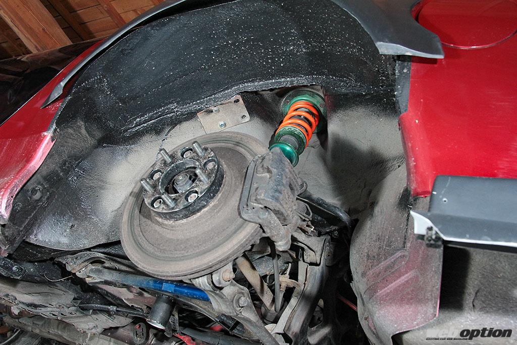 さらに、フロントはロアアームの取り付け部を加工して、約15mm外側にオフセット。効果的には延長ロアアームと同じで、ネガティブキャンバーを付けているのだ。というのも、FD3Sはタイヤハウスを拡張してタイヤを逃がすと、今度はキャリパーがアームに当たるようになる。そのため、調整式アッパーマウントで内側に入れず、ロアアーム延長で外側に出すネガキャン化が必須なのだ。