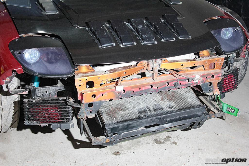 クーリングパートは、エアコンレスのVマウント仕様だ。銅3層ラジエターはサイドタンクが加工されていて、GC8のアッパーホースがピッタリだったという。L字アングルなどを使った自作とはいえ、かなり格安に作られている。真夏のサーキットでも水温は85度で安定するというから恐れ入る。
