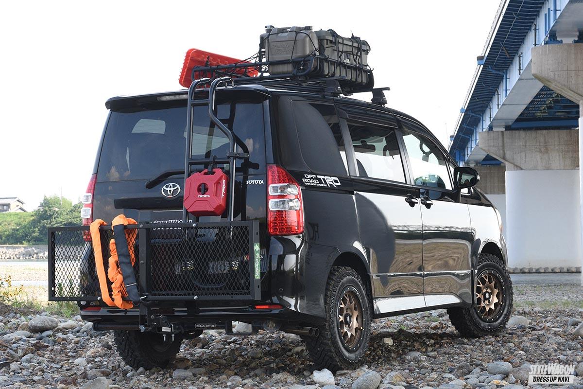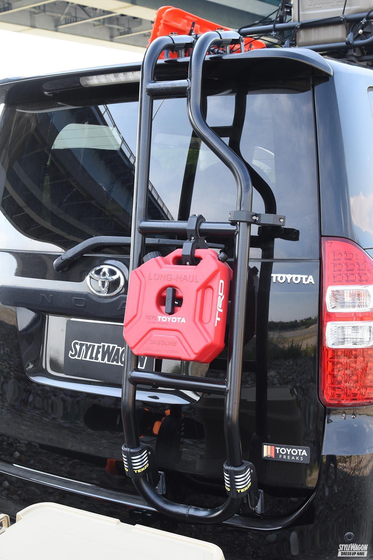 リアゲートのラダーはネットオークションでゲットしたという60系NOAH向けのものを流用。赤い携行缶がワンポイントになっている
