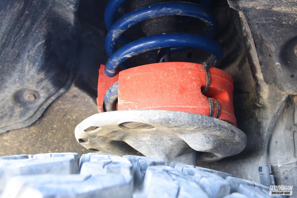 前後のコイルスプリングには10ミリ厚のラバースペーサーを挟むことで1G状態での沈み込みを軽減させている。