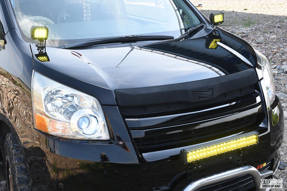 フロントグリル直下のLEDバーやボンネット両サイドのワークライトはイエローレンズに統一することでソレっぽい雰囲気を演出。