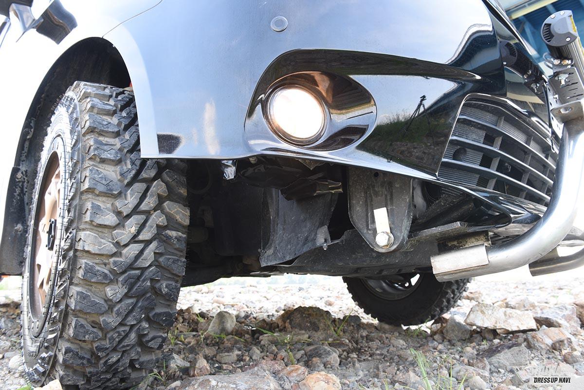 フロントバンパーは悪路でのアプローチアングルを稼ぐため20センチ近くカット。バンパー内部に収まっていた補機類は移設することで違和感のない外観をキープする。