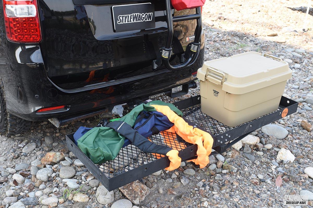 SOLEX製のヒッチメンバーには折り畳み可能なカーゴキャリアを装着。悪路でスタックしてしまった場合に引き上げてもらうため牽引ロープも常備しているのだとか。