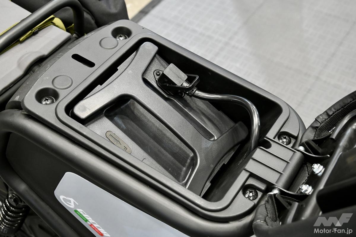 後輪にインホイールモーターを装備し、電源はリチウムイオンバッテリーから供給。しかもバッテリーは着脱式で、シート下のスペースに嵌め込む仕様となっている。バッテリー自体は軽くはないが、自動車用12Vバッテリーのようなサイズ感なので持ち運びに苦労することはないはず。一般家庭の100Vの電源で充電が可能。バッテリーを外しても、バイクに装着したままでも充電できる。
