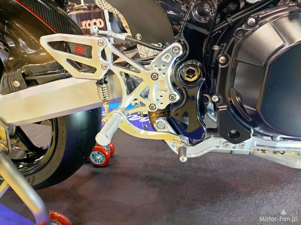 ガソリンタンクは真空機械圧縮によるカーボンコーティングを実施。シングルシートとシートカウルはワンオフ製作。アルミ削り出しのサイドフレーム&アンダーフレームはワンオフのプロトタイプだが、製品ラインナップ予定。