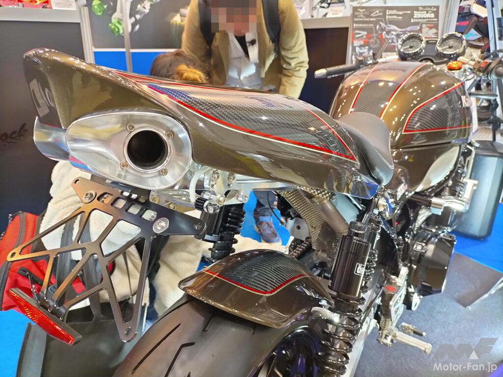 後方アップ型の集合マフラーは、Kファクトリー製エキパイにワンオフのテールパイプとサイレンサーを組み合わせ。テールカウル下にレイアウトしたサイレンサーは、箱型ながら2個所の丸型エンドを設けたユニークかつ個性的なフォルムにデザインされている。