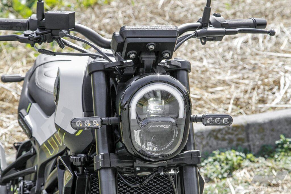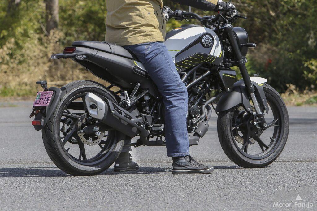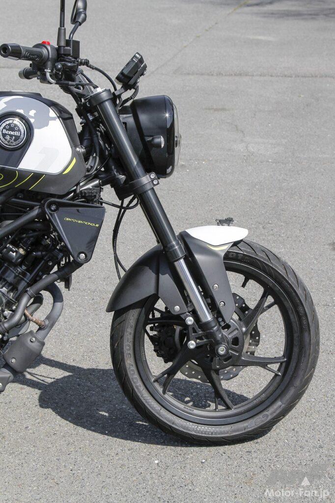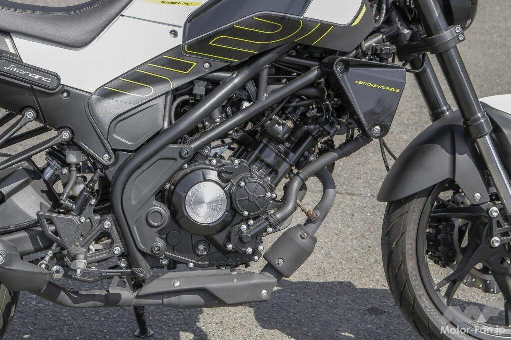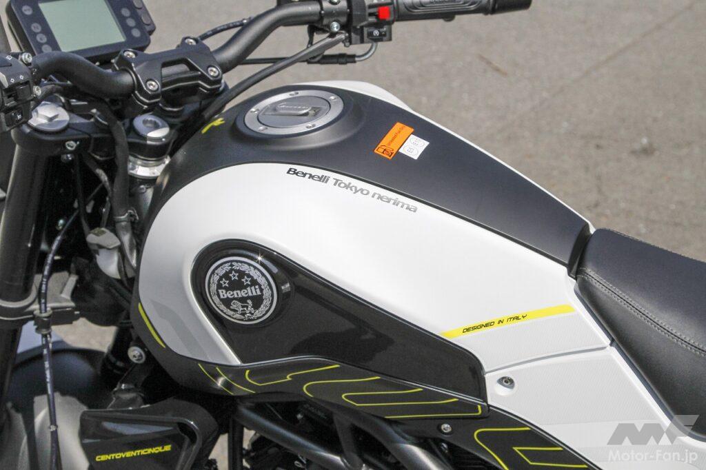 タンクからシートエンドにかけてインテグレートされたような流麗なボディスタイリングは、いかにもヨーロピアンデザインといった印象を受けました。1980年代の日本製スポーツバイクの多くも、ヨーロピアンスタイルを取り入れていたことを思い出します。レオンチーノ125のスタイリングにはそうした往時の雰囲気が感じられますが、エンジンを中心に凝縮感を持たせているところに現代的なエッセンスを感じます。いずれにしても、個性的なフォルムなので街で目立つこと請け合いです。
