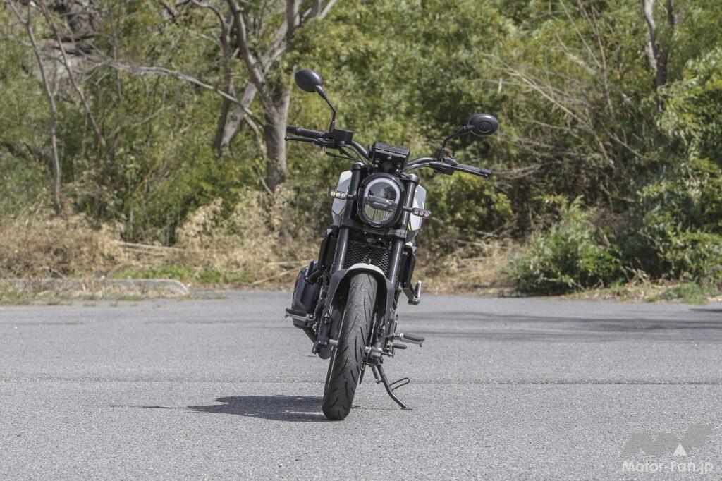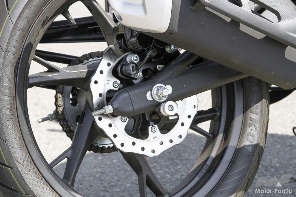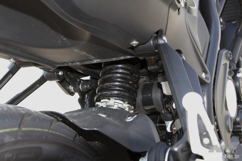 車格の大きさはそのまま走行安定性の高さになっています。直進安定性、コーナリング安定性ともに高くしっかりしている印象です。骨格にはスチール製トレリスフレームが採用されているのですが、それはおそらく250と共通なので、とにかく剛性が高いのです。加えて、スポーツ走行を意識したのか、倒立フロントフォーク、モノショック式リアサスとも硬めに設定してあり、結果的にカチッとした乗り味になっているのが特徴です。