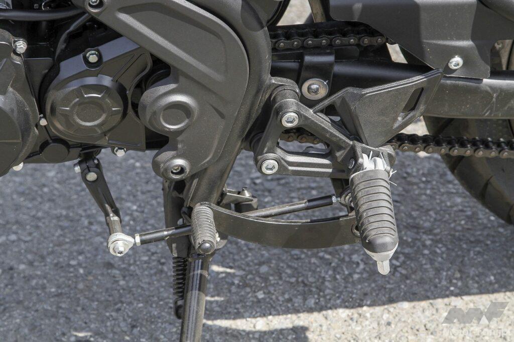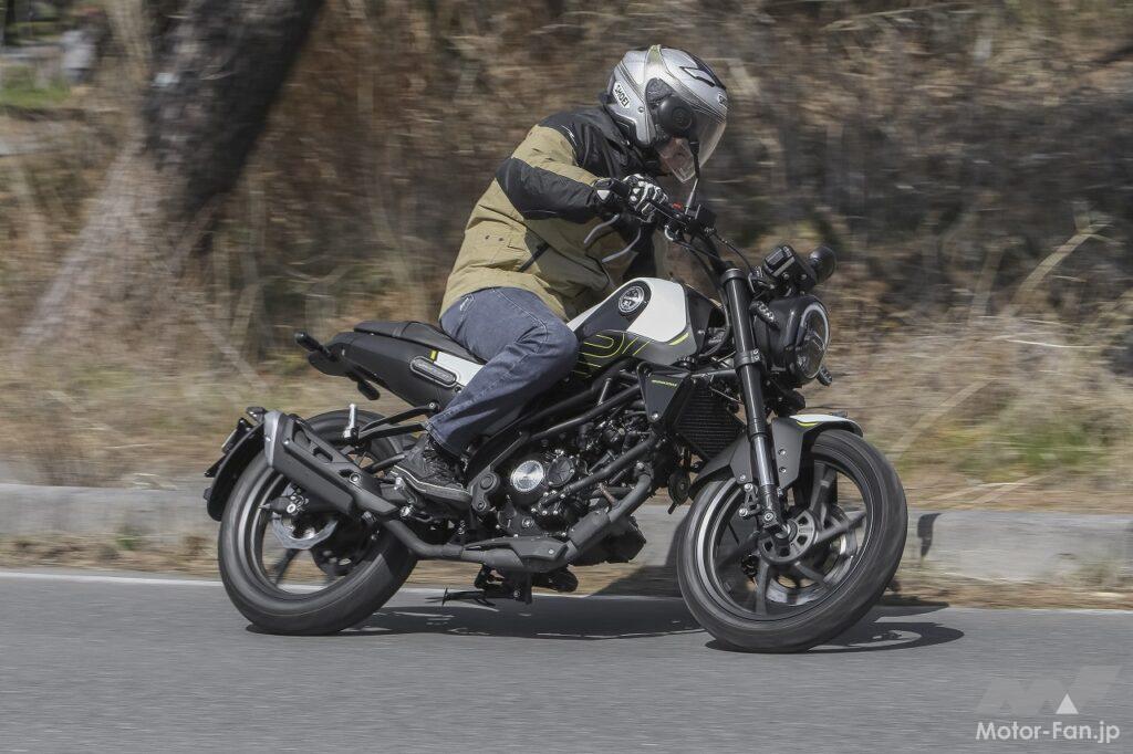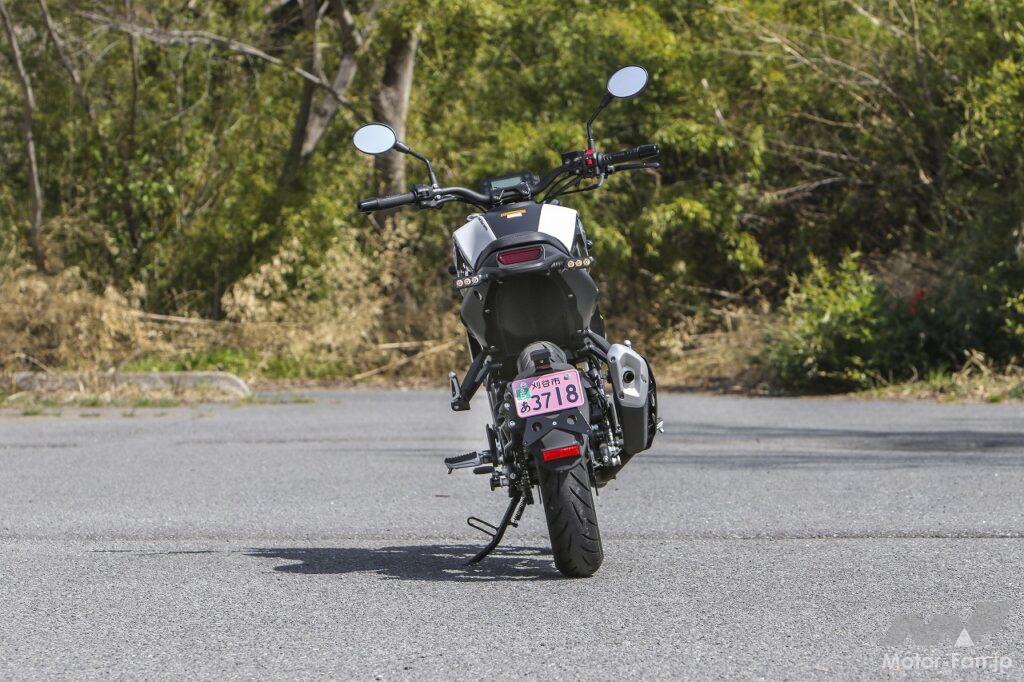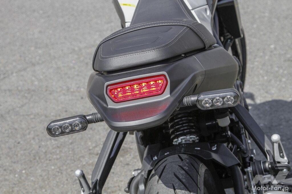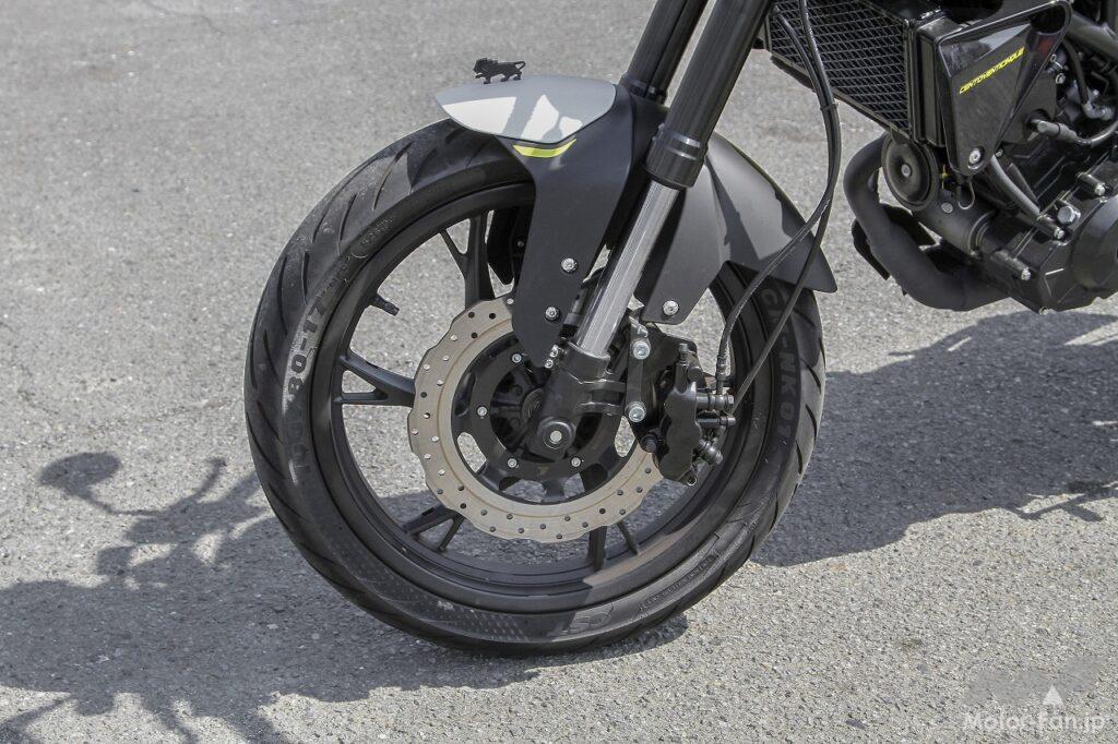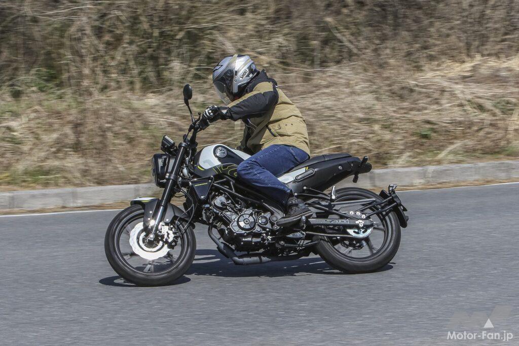 ハンドリング自体は、小型バイクならではの軽快性があり、ニュートラルな特性でもあるので扱いにくさはありません。前後ディスクブレーキのコントロール性や制動力に関しても大きな不満はありませんし、タイヤのグリップ性についても問題ありません。ただしスクランブラーカテゴリーとしてみた場合、ダート路をガンガン攻めるのはちょっと考えもの。もしもダート林道をツーリングするようなオフロード走行をメインステージにするなら、最低限タイヤはオフタイプに換装したほうがいいと思います。今回は少しだけフラットダートを走行してみましたが、普通に走るのならまったく問題ない走破性を発揮してくれました。