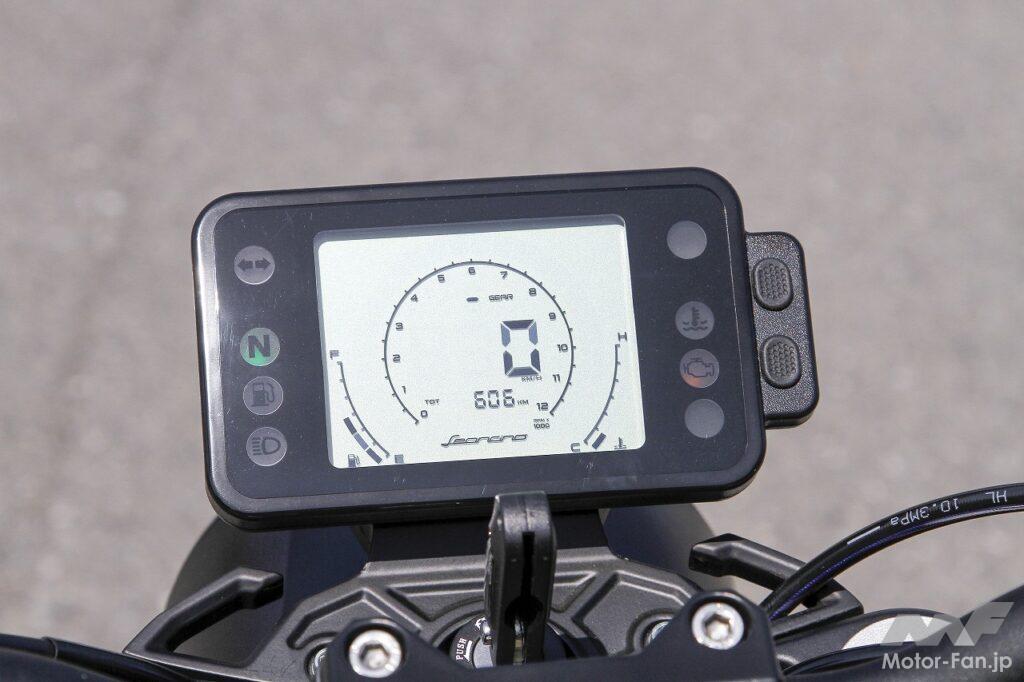 キーをオンにすると、スクエア形状の大型ディスプレイが明るく点灯します。フルデジタルのこのメーターは非常に見やすく、情報量も豊富です。セル一発で目覚めたエンジンは、水冷SOHC4バルブ単気筒で3プラグという珍しい方式を採用している。最高出力は9.4kw(12.8PS)/9500rpm、最大トルク10.0Nm/8500rpmというスペックとなっている。同クラスの日本製ロードモデルに比べてやや下回る数値ですが、果たしてそれが実走にどう影響するのか気になるところではあります。