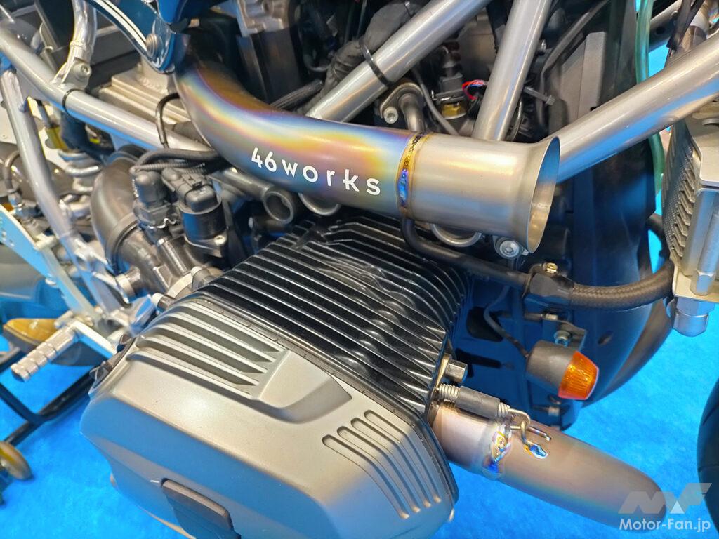 ワンオフのアルミ製エアクリーナーボックスから前方に伸びるチタン製の吸気孔には、「46 works」のホワイトロゴも配置。