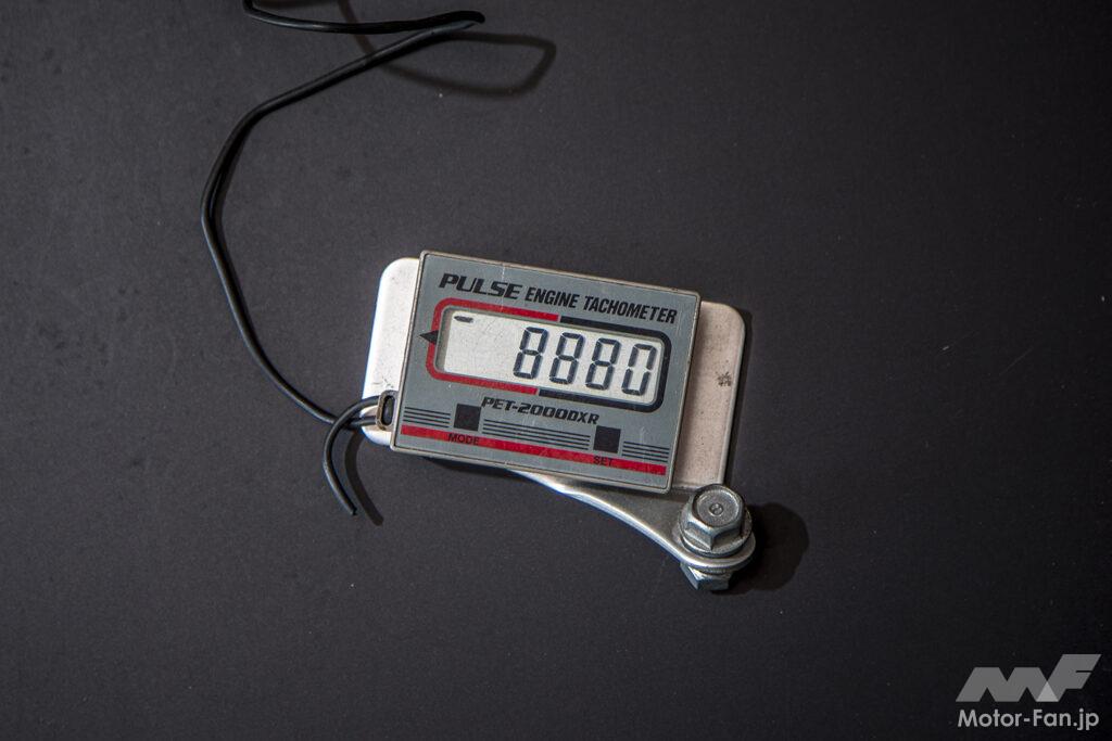 後付けタイプのタコメーターを取り付けての走行結果は、最高エンジン回転数は8900rpm。カタログ値の最高出力が7000rpmなので、これくらい回るということは調子がいいと言えるでしょう。とM&Fカビィの影山さん。