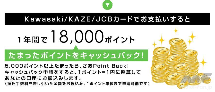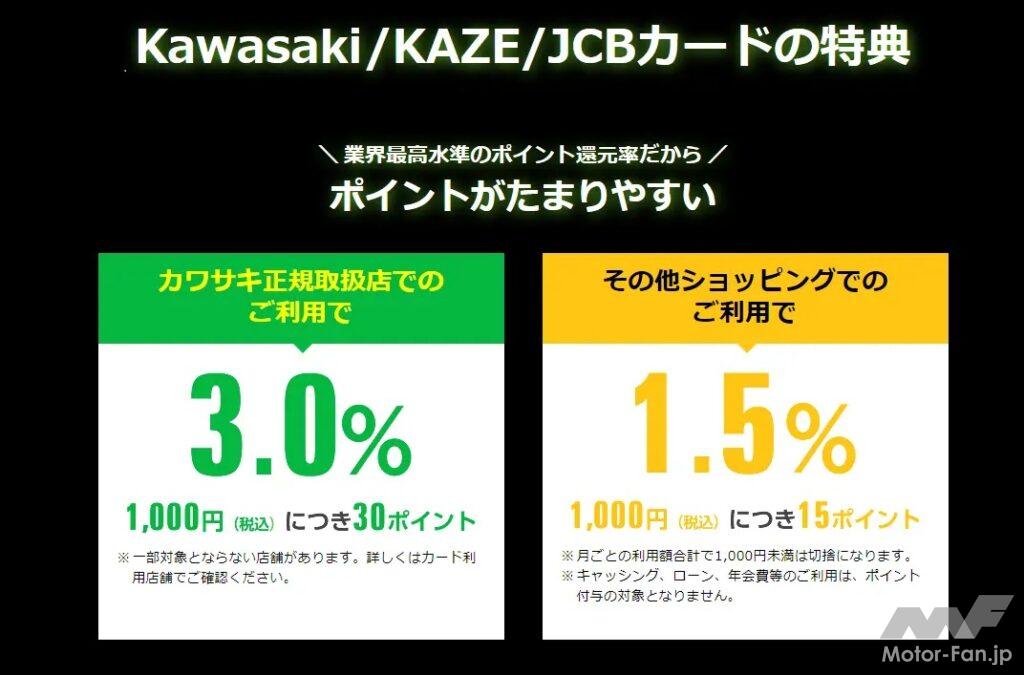 カワサキモーターサイクルやジェットスキーをさらに深く楽しめる、カワサキのライダーズクラブ「KAZE」では会員カードとクレジットカードが一体となった「KAZE/JCBカード」で新規入会キャンペーンを実施中だ。