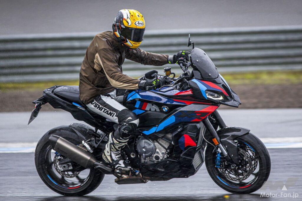 そうした限られた条件の中で感じたのは、S1000RRをベースとした直4エンジンの緻密なフィーリングだ。上品という表現を使ってもいいかもしれない。確かに低回転域からトルクフルで、おそらく一般公道なら6,000rpm以上を必要としないだろうが、ロードやダイナミック、そしてレースモードでもスロットルの反応は過敏すぎず、加えてクイックシフターのショックも比較的少なめだ。201psという分かりやすいスペックにばかり目が行きがちだが、実はスーパースポーツ由来のスムーズかつ潤沢な力量感こそが、M1000XRの美点の一つと言えるだろう。