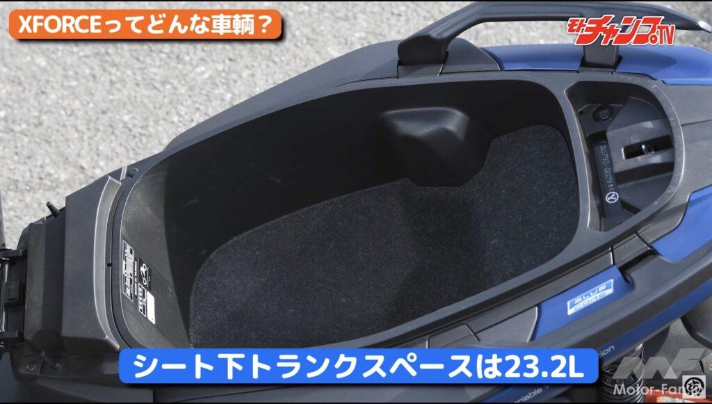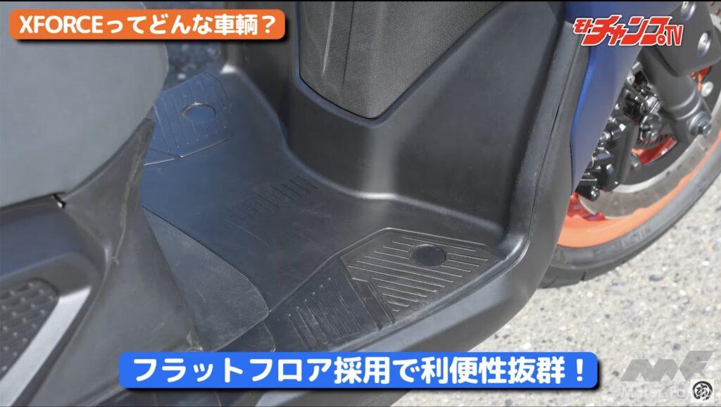 150ccクラスのスクーターとしては珍しくなってしまったが、X FORCEはフラットなフロアを採用している。フレーム剛性という意味では不利になるものの、利便性や自由度の高いポジションなどスクーターらしさを追求しているのだ。この点をチャボは大絶賛。コンビニフックが使えるなどケニー佐川も実用性の高さを評価している。