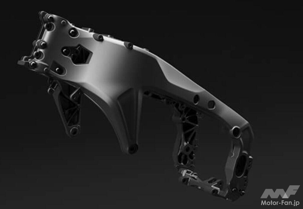 エンジンを剛性メンバーに活用するダイヤモンドタイプの軽量CFアルミダイキャスト製フレームは、デルタボックスフレームと呼ばれていた当時を彷彿とさせる様シルバー塗装が施されている。